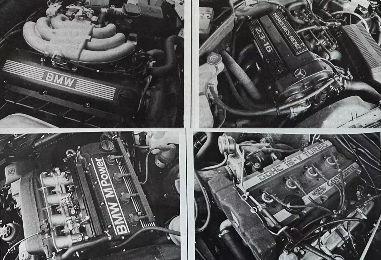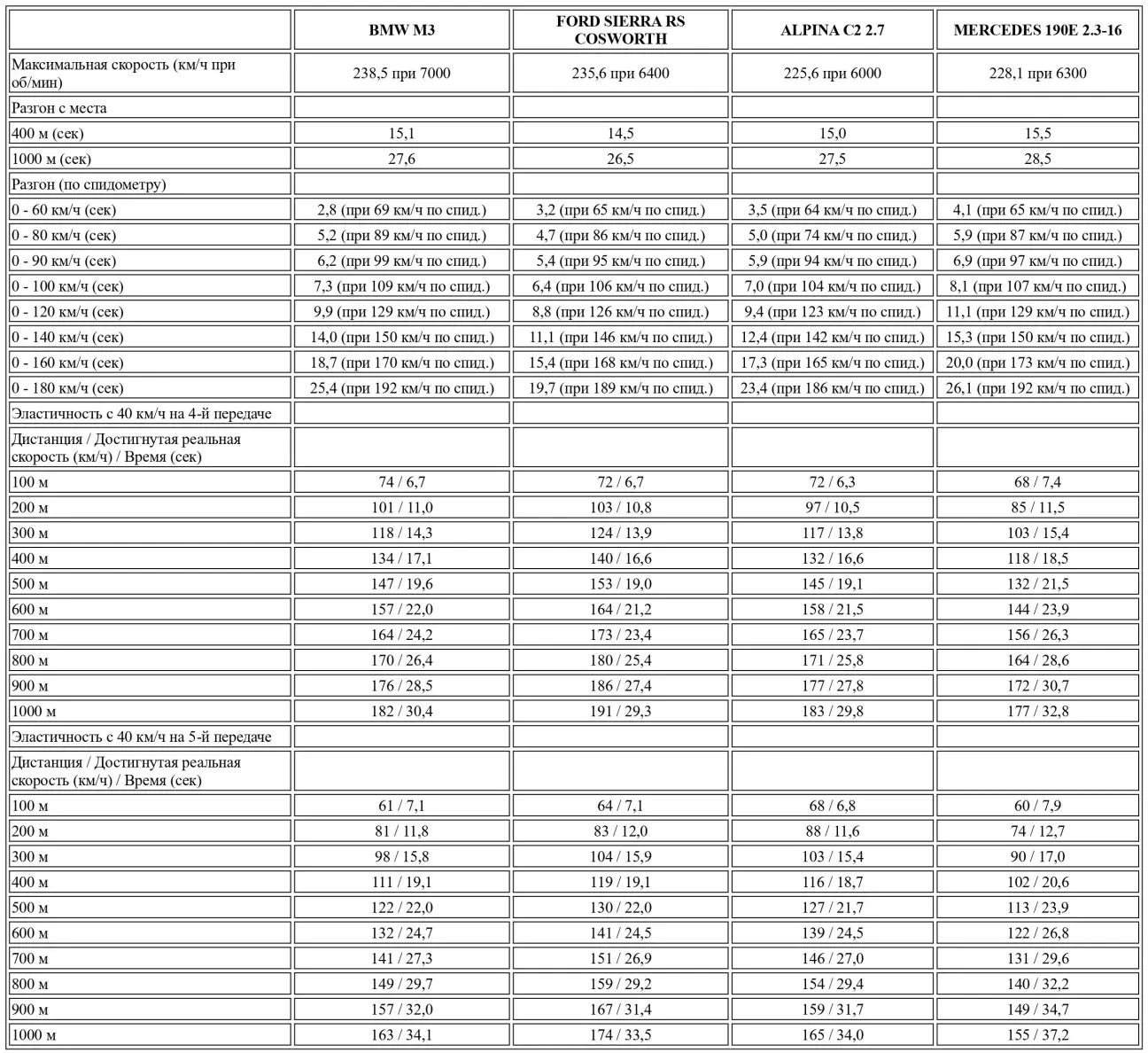 На автосалоне во Франкфурте в 1985 году 2,3-литровый 200-сильный мотор BMW M3 мало кого впечатлил, и даже высказывались мнения, что BMW просто копирует Mercedes. Ошибка: достаточно проехать несколько километров за рулем BMW M3, чтобы понять, что Мюнхену удалось превзойти Штутгарт, к чему баварский производитель, впрочем, был обязан. Более полная кривая момента и большая мощность выражаются в значительно лучшей отзывчивости агрегата. Его удельная мощность составляет почтенную величину 86,8 л. с. на литр объема, что является исключительным результатом для атмосферного двигателя. Конечно, в этой области его опережает наддувный мотор Sierra, который позволяет себе даже преодолеть магический порог в 100 л. с. на литр. Но сюрприз преподносит Alpina C2, которая, обладая самой высокой мощностью, предлагает и самое выгодное соотношение веса к мощности. С другой стороны, она обделена в плане аэродинамики, что объясняет ее отставание по максимальной скорости. С этой точки зрения BMW M3 выделяется, и здесь следует приветствовать отличную работу создателей BMW. Мощность позволяет ей компенсировать единицу SCx, которую она проигрывает Mercedes, и выйти вперед с результатом более 238 км/ч. Она опережает Sierra, которая при заявленных 240 км/ч так и не смогла превысить 235 из-за слишком рано срабатывающего ограничителя оборотов. Далее следуют Mercedes со скоростью 228 км/ч и Alpina — 225 км/ч.