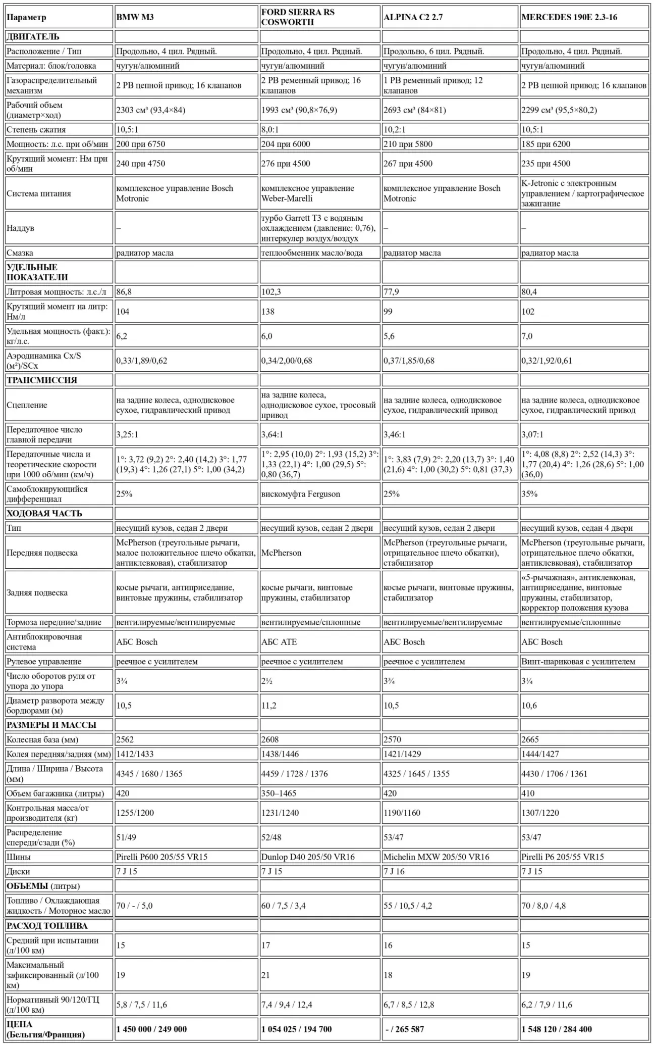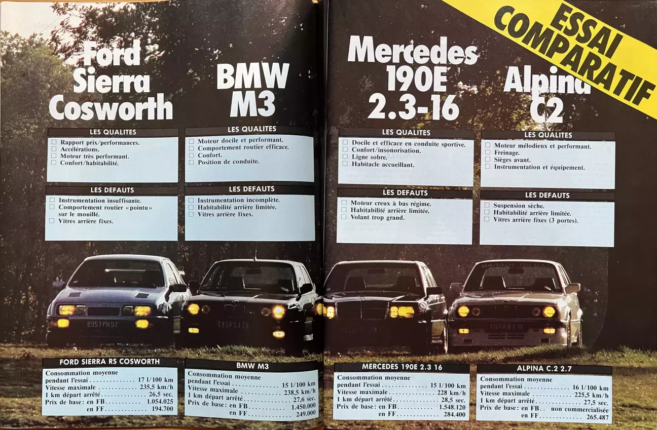 Перевод теста-сравнения Mercedes W201 190E 2.3-16 vs BMW E30 Alpina C2 vs Ford Sierra Cosworth vs BMW E30 M3 от бельгийского автомобильного журнального издания Le Moniteur de l’Automobile, № 862, Декабрь, 1986.