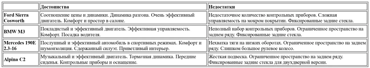 Ford Sierra RS Cosworth: Впечатляющие ускорения, дикий характер, который нужно укрощать, и, прежде всего, непревзойденное соотношение цены и динамики — у RS Cosworth достаточно аргументов, чтобы влюбить в себя. Не лишена она и несовершенств, но очевидно, что любитель острых ощущений смирится с нестабильной управляемостью или приборной панелью, недостойной такого спорткара, ради возможности в полной мере насладиться действительно исключительным мотором.