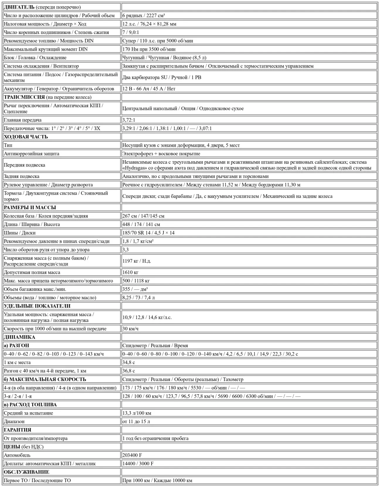 Этот двигатель, особенно хорошо настроенный на нашем тестовом экземпляре, позволил нам превысить заявленную производителем максимальную скорость в 170 км/ч: по хронометру мы достигли 180 км/ч в одном направлении и 176 км/ч как средний максимум в обоих направлениях. Динамика разгона менее убедительна: на достижение 100 км/ч потребовалось 14,9 сек., а дистанция в один километр с места была пройдена за 34,8 сек., что является средним показателем для автомобиля такого габарита и литража. Холодный пуск требует использования ручного привода воздушной заслонки даже в мягкую погоду. Более того, необходимо некоторое время держать заслонку прикрытой, но даже при этом работа непрогретого мотора не отличается особой приятностью. Рукоятка заслонки позволяет фиксировать ее в различных положениях, однако на приборной панели не помешал бы контрольный индикатор, так как руль частично перекрывает рукоятку, и мы иногда забывали вернуть ее в исходное положение.