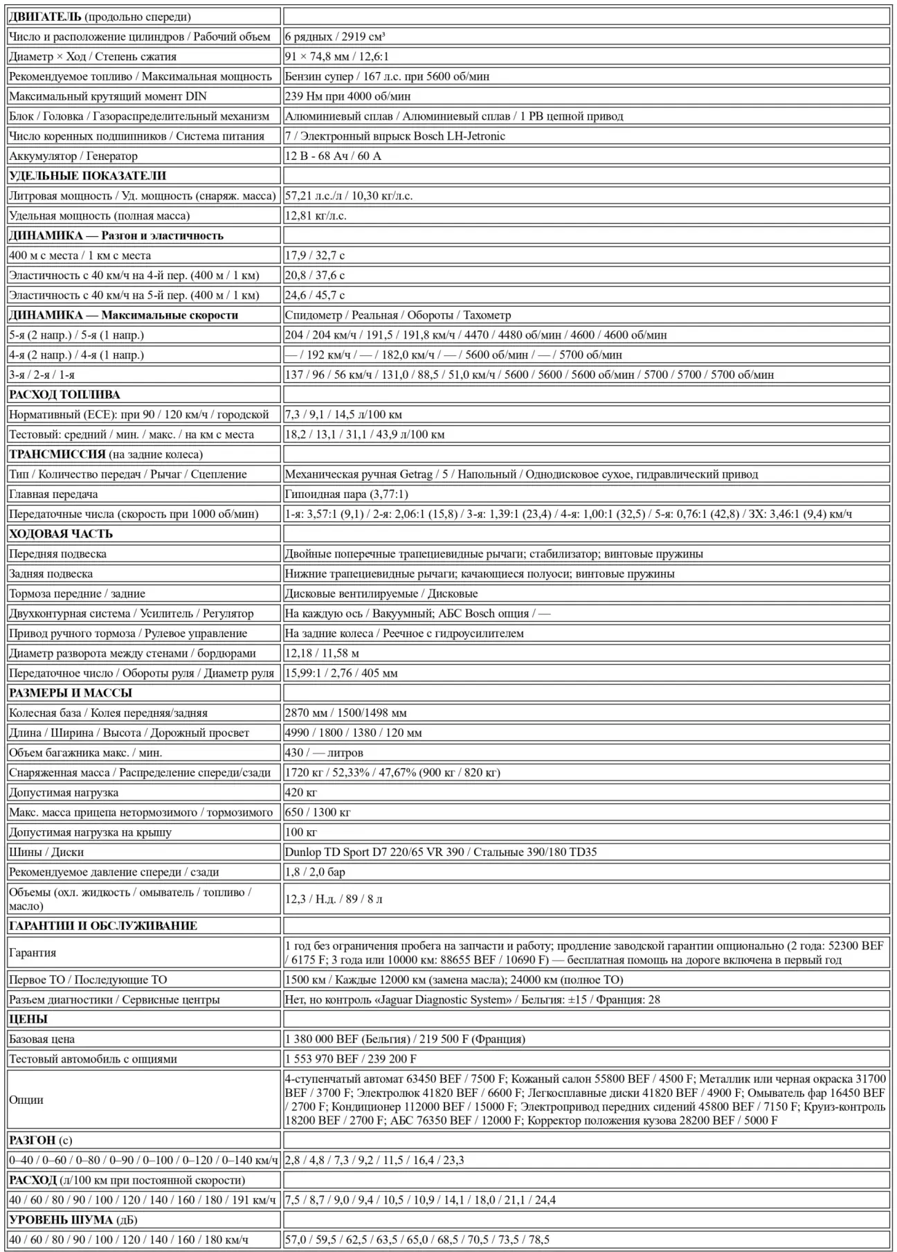 Бельгийский импортер, предоставивший нам автомобиль, особо подчеркивал «молодость» агрегатов на момент начала теста. «Мы заметили, что двигатели Jaguar должны преодолеть порог в 10 000 км, чтобы выйти на пик формы! Jaguar — завод совсем небольшой, — напоминал он. — У нас нет возможности проводить столь же длительную обкатку машин, сходящих с конвейера, как у других производителей...» На одометре нашего XJ6 было немногим более 3000 км, когда мы подвергли его испытаниям. Это может оправдать легкую потерю формы! Производитель заявляет для этой великолепной рядной «шестерки» максимальную мощность 167 л. с. при 5600 об/мин, что дает удельную мощность 57,2 л. с./л. Максимальный крутящий момент 239 Нм достигается при 4000 об/мин — довольно высокие обороты для обеспечения лучшей эластичности при спокойной езде. Не стоит забывать, что клиенты Jaguar вряд ли будут использовать свой седан как спортивное купе...
