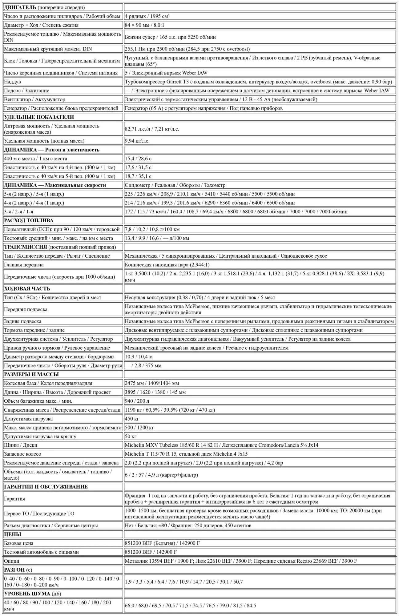 В остальном технические данные указывают на полностью независимую подвеску типа McPherson (с качающимися рычагами спереди и поперечными тягами сзади), дисковые тормоза на всех колесах (пока без ABS — инженеры Lancia еще не нашли убедительного решения, которое бы гармонировало с дифференциалом Torsen) и рулевое управление с гидроусилителем. Своим 2-литровым двигателем, заимствованным у Thema i.e. Turbo, Delta HF 4WD подчеркивает как спортивные, так и коммерческие амбиции Lancia: компания сделала ее самостоятельной моделью, а не просто полноприводной модификацией существующей версии, что сейчас чаще всего практикуется другими производителями. Предлагаемая практически по той же цене, что и Thema Turbo Diesel или Fiat Croma i.e. Turbo с ABS, Delta HF 4WD вдобавок обладает сравнительно богатым оснащением (центральный замок, передние электростеклоподъемники, легкосплавные диски и т. д.) и довольно роскошной отделкой салона (например, вставки из замши на сиденьях и дверных панелях). Пока мы ждем вечно гипотетическую Audi 90 Quattro с 20-клапанным мотором (о которой говорят уже целую вечность!), круг конкурентов ограничен четырьмя машинами: Audi Coupe Quattro (136 л. с.), BMW 325ix (171 л. с.), Ford Sierra XR4x4 (150 л. с.) и Mazda 323 4x4 (также 150 л. с.). Однако соотношение цены и оснащения выводит итальянский автомобиль на очень выгодные позиции. Не говоря уже о его характеристиках...