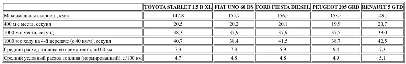 Toyota, как и VW, а до них Fiat и Daihatsu, выходят на рынок микролитражных дизелей с новой концепцией сверхмалого рабочего объема, который еще вчера считался бессмысленным или недостижимым с точки зрения эффективности. Daihatsu установила планку на отметке 1000 см³ (простите, 999) с атмосферными и турбированными моторами; Fiat предпочел объем 1300 см³, от которого постепенно отказывается в пользу 1700 см³ на модели Uno. VW недавно вывел на рынок Polo 1300 Diesel; наконец, Toyota запускает совершенно новый 1500-кубовый агрегат. «Мы могли бы использовать 1,8-литровый дизель от Corolla...» — объясняют японцы. «Но этот блок был слишком тяжел для такой маленькой машины, как Starlet; поэтому мы начали с чистого листа, спроектировав более легкий и компактный силовой агрегат». На бумаге — а импортеры охотно пускаются в подобные сравнения — Starlet 1500 D не уступает бензиновой 1000-кубовой версии. Та же мощность, те же динамические характеристики, но... меньший расход топлива.