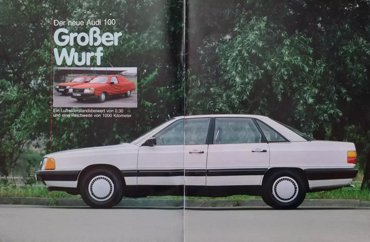 Гладкие поверхности кузова можно было увидеть еще год назад на Франкфуртском автосалоне. Там экспонировался ингольштадтский исследовательский автомобиль, в котором уже угадывались черты новой Audi 100. При разработке внешнего облика инженеры под руководством Фердинанда Пиха, внука Порше и главы технического департамента Audi, подхватили нить, обрыв которой многие оплакивали: традицию Ro 80. Прошло почти ровно 15 лет с тех пор, как NSU вывела на рынок этот революционный автомобиль. С тех пор он стилистически повлиял на многие разработки, однако среди них до сих пор не было ни одной модели Audi NSU. Теперь все изменилось: новая Audi 100 по форме скорее является преемницей Ro 80, нежели предыдущей Audi 100. В техническом же плане она представляет собой дальнейшую эволюцию предшественницы. Тот факт, что кузов Ro 80 оказал колоссальное влияние на развитие автомобилизма, связан с его аэродинамически выгодной формой, которая уже тогда позволила достичь коэффициента лобового сопротивления 0,37. Разумеется, путем оптимизации можно довести до приличных показателей и обычные формы кузова. Так, сегодня достижимы значения Cx в районе и ниже 0,4. Однако показатели 0,3 или чуть выше, которыми обладает новая Audi 100, достижимы только при использовании базовой формы, впервые примененной на Ro 80: плоский низкий перед, восходящая к корме поясная линия, высокая задняя часть.
