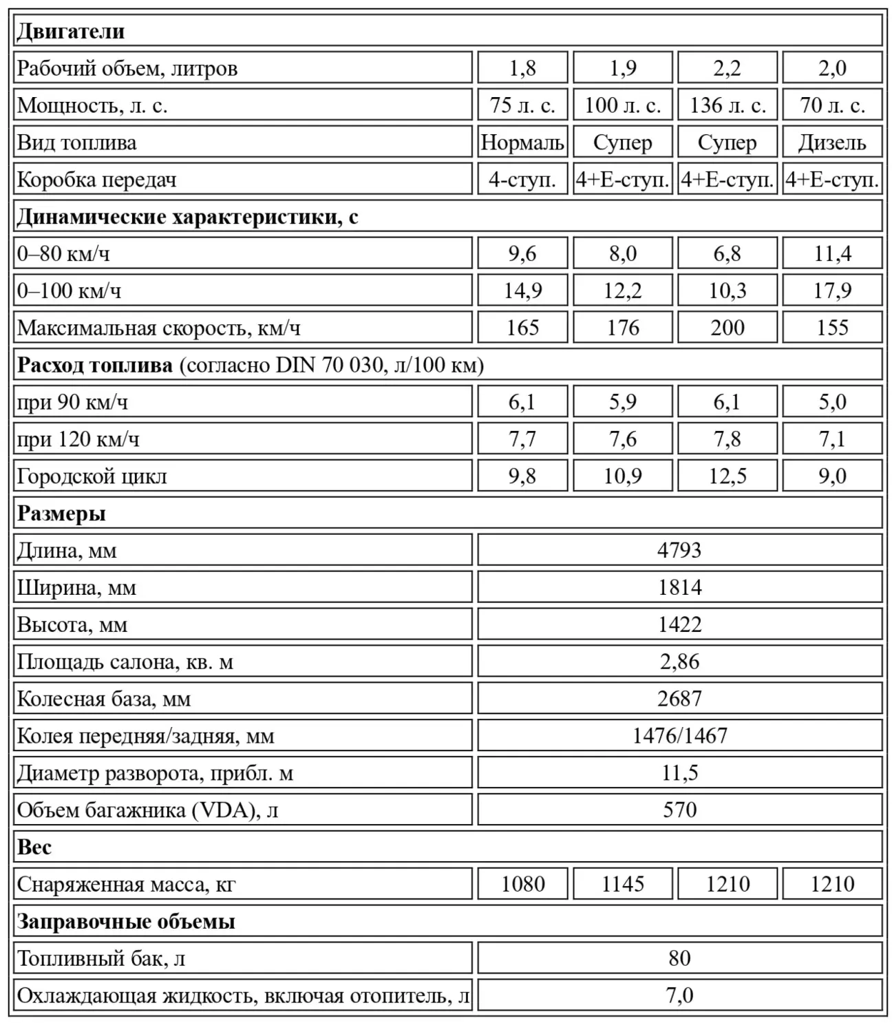 Помимо этого оптимизированного по расходу четырехцилиндрового агрегата, предлагаются пятицилиндровый мотор 1,9 литра (100 л. с.), пятицилиндровый 2,2 литра с впрыском бензина (5E) мощностью 136 л. с. и 2-литровый пятицилиндровый дизель (70 л. с.). Дизельная версия теперь развивает максимальную скорость 155 км/ч. Для 1,9-литровой версии этот показатель равен 176 км/ч, а 2,2-литровая 5E со своими 200 км/ч теперь почти так же быстра, как прежний Turbo.