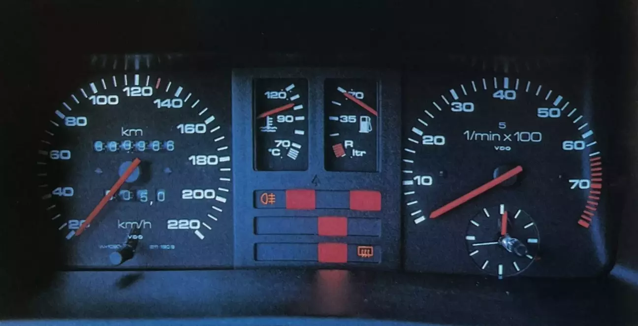 Приборная панель Audi 90 — иная и новая! Раз вам так говорят! Несомненно, нужно присмотреться повнимательнее, чтобы в этом убедиться. Ведь приборы выполнены в стиле ингольштадтских изделий: крупные спидометр и тахометр, указатель температуры охлаждающей жидкости и датчик уровня топлива. Аналоговые часы наконец-то встроены в нижнюю часть тахометра. Не забудем и о контрольных лампах, собранных в центре приборного щитка. Всё это отлично видно и читаемо. Классика, эффективность. Но хотелось бы чуть больше информации — например, термометр и манометр системы смазки, а также вольтметр. Audi 90 2.2 позиционируется как спортивно-солидный автомобиль. И первое определение могло бы включать приборы, которые встречаются, например, в Audi 80 GTE. Органы управления сосредоточены либо на рулевой колонке (указатели поворота, переключатель света, стеклоочиститель и омыватель), либо по обе стороны от комбинации приборов. Как в Audi 80? Отнюдь! В Audi 90 они занимают те же места, но для некоторых изменен принцип работы. Так, управление фарами теперь осуществляется не нажатием, а вращающейся рукояткой. Деталь… С этой стороны Audi 90 — лишь старшая сестра 80-ки «новой волны». Жаль, но экономически оправдано…