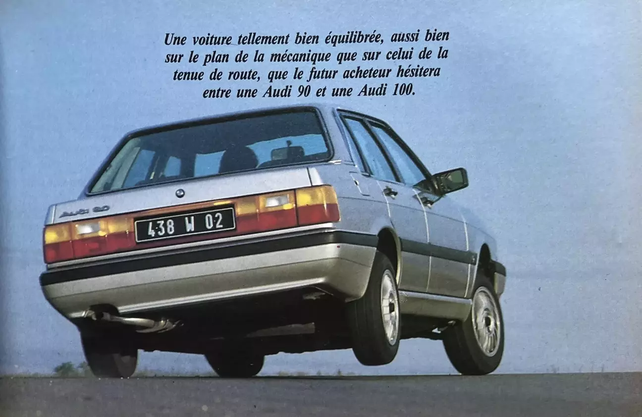 Создатели Audi 90 хотели выделить ее из ряда 80-й модели, присвоив новый индекс, но можно было бы ожидать большей индивидуальности. Она сохраняет явное семейное сходство со своей младшей 4-цилиндровой сестрой: ее кузов отличается лишь в деталях; техническая архитектура напрямую заимствована у 80-ки, хотя эта гамма обладает эксклюзивным правом на 5-цилиндровые моторы; подвески, тормозная система, несущий остов аналогичны тем, что у 80. Предназначение 90, тем не менее, иное и полностью соответствует намерениям руководства в Ингольштадте: расположить эту линейку между 80 и 100, используя подход, отдающий приоритет комфорту без ущерба для динамики. Операция удалась. Новая 90 действительно гостеприимна и создает впечатление, что внутри она больше, чем кажется снаружи. Она также предлагает удовольствие больших седанов: тишину, комфорт кресел, чувство безопасности. И потом, ее новый мотор 2,2 проявляет свой блеск через характеристики, тишину и, прежде всего, эластичность. Он разгоняет машину до скоростей, которые на других сочли бы неразумными, но управляемость соответствует мощности и находится в идеальном балансе. В конце этого теста признаемся, что колеблемся в предпочтениях между 90 и 100. Первая даже кажется заставила свою старшую сестру выглядеть старее; ее классический силуэт и вездесущее ощущение легкости (в вождении, в повадках на дороге, в подвеске…) теперь сильно контрастируют с впечатлением величия и тяжеловесности 100-й модели. Прекрасная работа, эта Audi 90, даже если она действительно очень скрытна и если она страдает от некоторого недостатка оснащения: ее скрытое очарование покоряет бессознательно.
