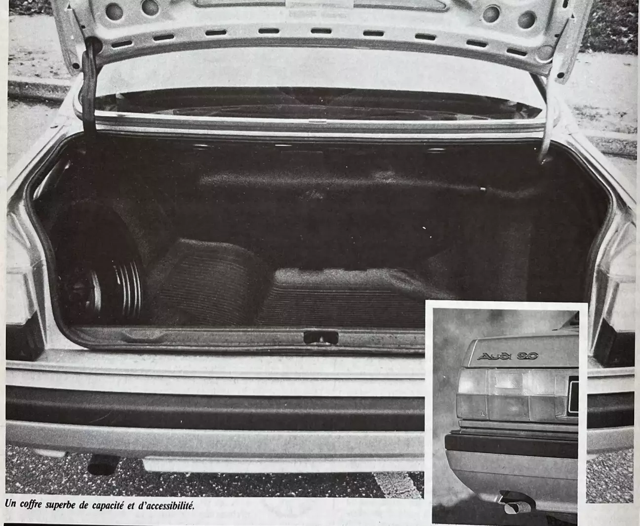Крышка багажника имеет тот же профиль, что и у Audi 80, с вырезом между двумя фонарями, опускающимся до самого бампера. Доступ в багажник — внушительного объема — благодаря этому значительно облегчен. Отметим здесь, что Audi вновь выбрала решение с временным запасным колесом («докаткой»), которое экономит немало места в пользу багажа, но не дает тех же возможностей, что традиционное колесо. Помимо этих деталей и не забывая о боковых молдингах, соединяющих передний и задний бамперы, Audi 90 напоминает (слишком?) новую 80. Отметим также большие (чтобы не сказать гигантские) щетки стеклоочистителя, которые отлично очищают зону видимости водителя, и мягкий профиль вокруг заднего стекла, направляющий потоки воды к задним стойкам крыши, что сохраняет хорошую обзорность назад. Audi 90 2.2 оснащена двумя наружными зеркалами только с механической регулировкой. Зато электрический центральный замок входит в стандартное оснащение — механизм заведует блокировкой багажника, но не касается лючка бензобака. Пробки с ключом, видимо, достаточно.