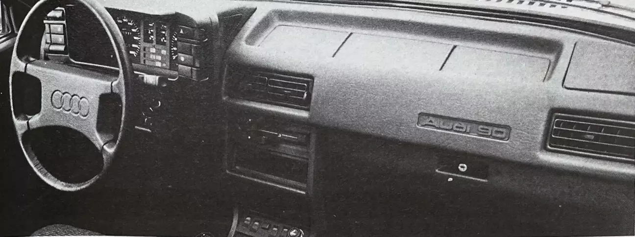 Поговорим об отделке! Немецкий производитель сразу вывел свою новинку на передовой уровень престижа. Была выбрана стильная, комфортабельная и мягкая отделка с обильным использованием ворсистых материалов. Этим салон напоминает интерьеры Audi 100. И чтобы хоть как-то обозначить разницу, приборная панель Audi 90 была изменена… в нескольких деталях, таких как дизайн переключателей. Тон задан настолько четко, что создатели Audi 90 не сочли нужным предлагать несколько вариантов исполнения. Audi 90 — это… Audi 90! Ни CC, ни CD, ни CS, просто Audi 90!