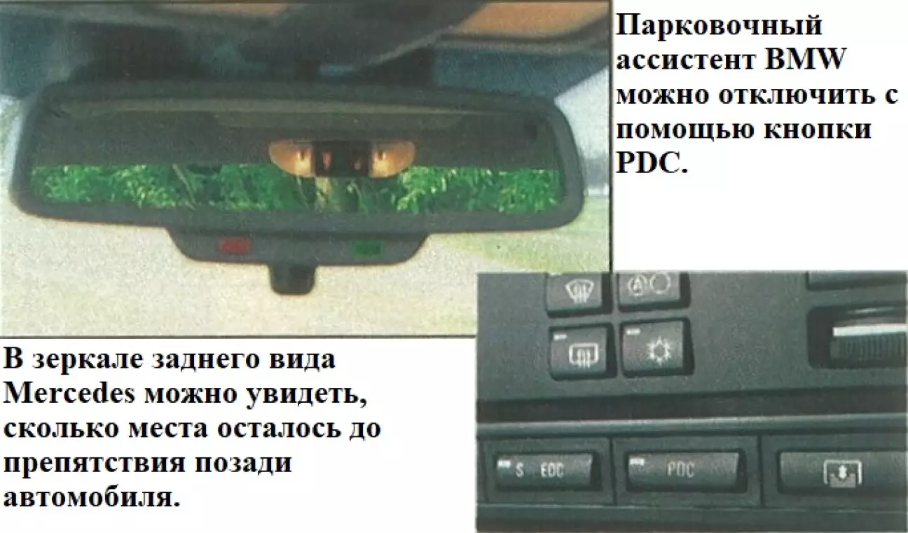 Система Park Distance Control (1250 марок) на седьмой серии сигнализирует водителю звуковыми сигналами разной тональности о том, сколько места осталось до ближайшего препятствия при парковке. Требуется определенное привыкание, чтобы отличить звук, предупреждающий о дистанции спереди, от того, что раздается при сближении сзади, что в тесных парковочных карманах является минусом. Непрерывный сигнал у BMW указывает на остаточное расстояние около 20 сантиметров. Система Mercedes под названием Parktronic (1438 марок) упрощает задачу: к акустической индикации здесь добавлена визуальная. Это позволяет совершать маневры по сближению с стоящим позади автомобилем, не поворачивая головы, так как за шкалой индикатора для кормы можно следить через зеркало заднего вида. Препятствие, расположенное под углом, отображается сегментами разной длины; полное заполнение одной из шкал у Mercedes соответствует дистанции в 12 сантиметров.