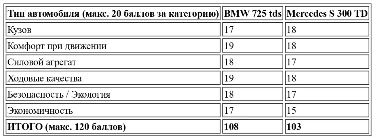 В этих дисциплинах дизельные варианты не отличаются от своих бензиновых собратьев, что справедливо и для прочих известных качеств моделей. В Mercedes пассажирам предоставлен почти избыточный простор; BMW предлагает меньше места, особенно на задних сиденьях, а также сильнее стесняет водителя и переднего пассажира на уровне плеч. Это дань меньшей высоте кузова и большему наклону боковых стекол. Тем не менее, в данном сравнении BMW 725 tds — вариант предпочтительный, и не только потому, что она оказывается выгоднее при покупке и в эксплуатации. Ведь помимо типичных динамических достоинств марки BMW, она предлагает и лучший ездовой комфорт — именно это должно заставить Mercedes серьезно задуматься.