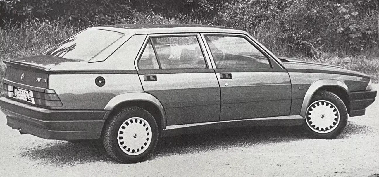 Alfa Romeo 75 знакома нам с момента своего дебюта. Верно, что модели 75 всего три года, но при рождении она сменила все еще бодрую Giulietta, унаследовав от нее всю агрегатную базу и основание кузова; ее единственными козырями были новый дизайн (оспариваемый некоторыми стилистами из-за характерного излома поясной линии в задней части) и иное оформление интерьера. Таким образом, 75-я сохранила классическую для Alfa Romeo компоновку: продольно расположенный двигатель спереди, центральный карданный вал, передающий крутящий момент на объединенные в один узел коробку передач и дифференциал в центре заднего моста, независимая передняя подвеска и задний мост типа De Dion, дисковые тормоза на всех колесах (вентилируемые спереди)… и всё это в трехобъемном четырехдверном кузове, рассчитанном на пять мест.