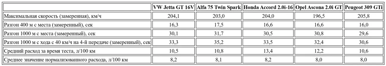 В наших руках автомобиль, предоставленный бельгийским импортером, сделал именно то, что от него ожидали. Максимальная скорость составила 204,1 км/ч на пятой передаче при 6450 об/мин — чуть выше оборотов максимальной мощности. Таким образом, она практически сравнялась с Golf из нашего теста в № 865 (сравнение Golf GTi 16V, R11 Turbo, 309 GTi и Kadett GSI), который разогнался до 204,5 км/ч. Этот результат логичен: Jetta тяжелее примерно на тридцать килограммов, но обладает лучшей аэродинамикой, всегда более выгодной для трехобъемных кузовов. Очевидно, одно компенсирует другое. В чистом разгоне Jetta GT 16V достигла 100 км/ч за 9,1 с (как и Golf), прошла 400 и 1000 метров за 16,3 и 30,1 с соответственно (против 15,9 и 29,4 у Golf). В замерах эластичности при старте с 40 км/ч динамика аналогична. Jetta GT 16V прошла километр за 33,3 с на четвертой передаче и за 37,4 с на пятой (32 и 35,3 с у Golf).