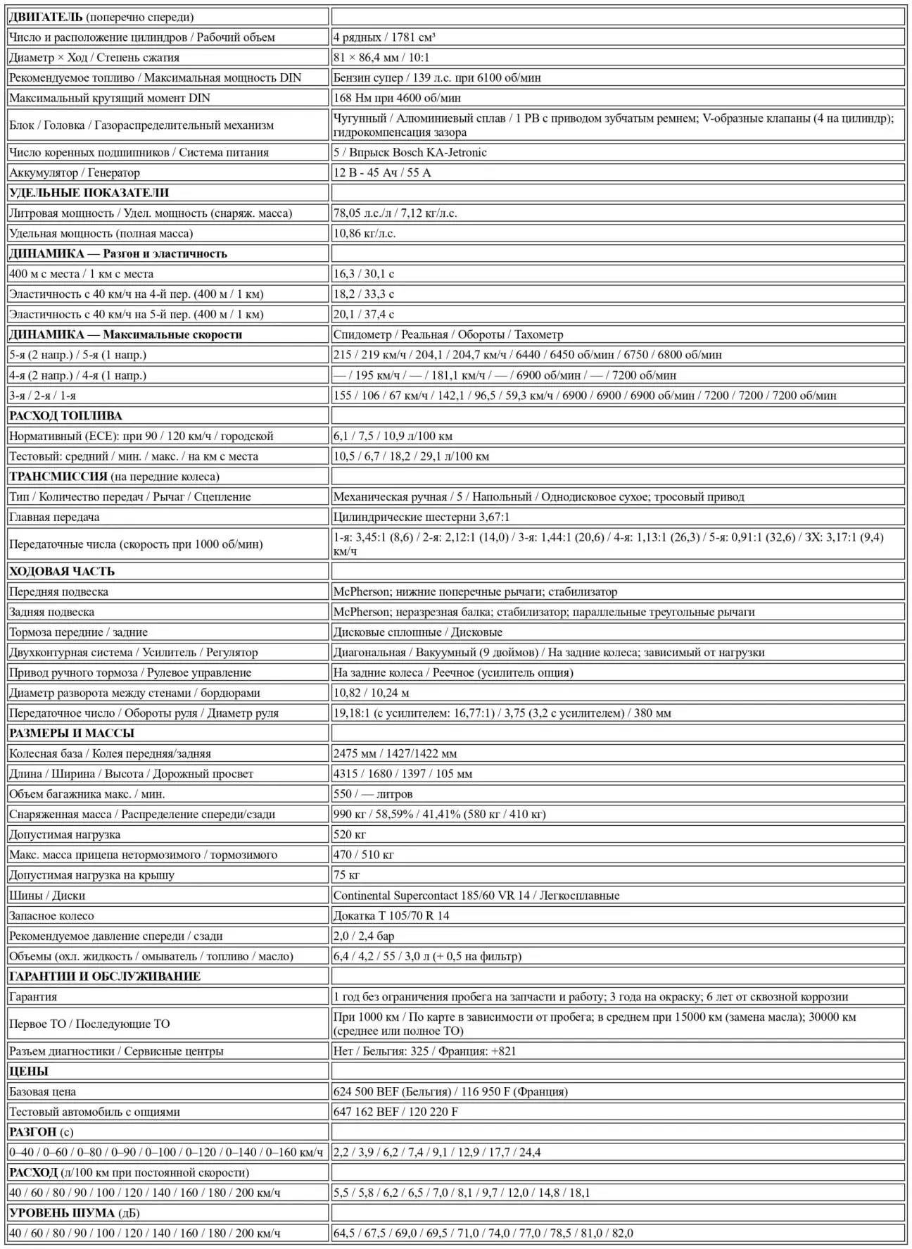 Небольшая прибавка в весе (30 кг) повлекла за собой чуть возросший аппетит. Лучшая аэродинамика компенсирует этот недостаток при равномерном движении, но бесполезна в обычном режиме эксплуатации. Средний аппетит Jetta составил 10,45 л/100 км, тогда как Golf был экономичнее (9,9 л/100 км). При 90 и 120 км/ч Golf и Jetta показали почти равные результаты — 6,5 и 8,1 л/100 км. В экономичном режиме Jetta оказалась менее жадной — 6,7 л/100 км (7,7 у Golf на том же маршруте при той же средней скорости), в то время как оба автомобиля проявили одинаковую булимию при экстремально быстрой езде: 18,2 л/100 км. Как видим, VW Jetta GT 16V остается одной из самых бережливых в своем классе, что свидетельствует о «здоровье» ее мотора. С баком объемом 55 литров она предлагает запас хода в 500 км на радость любителям дальних... и быстрых поездок!