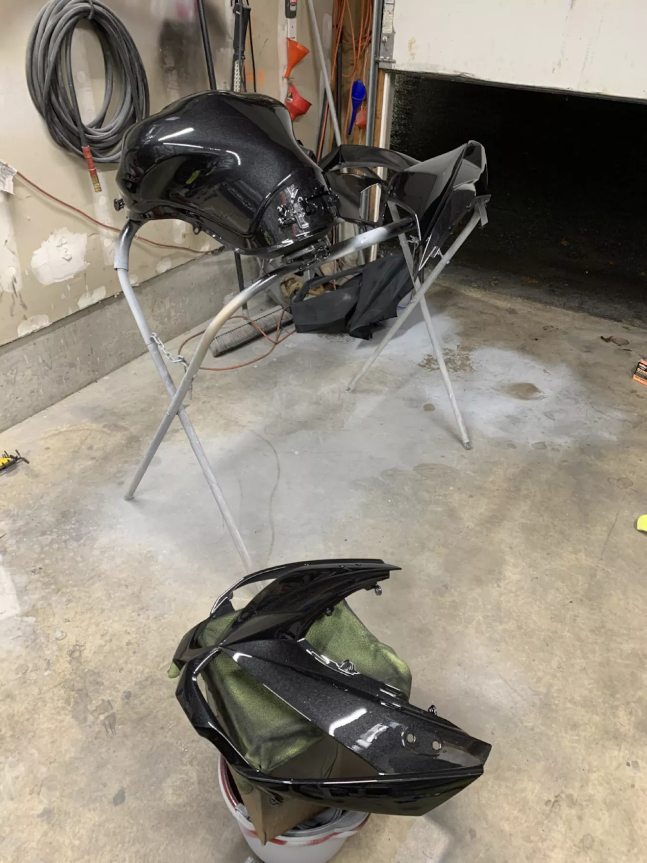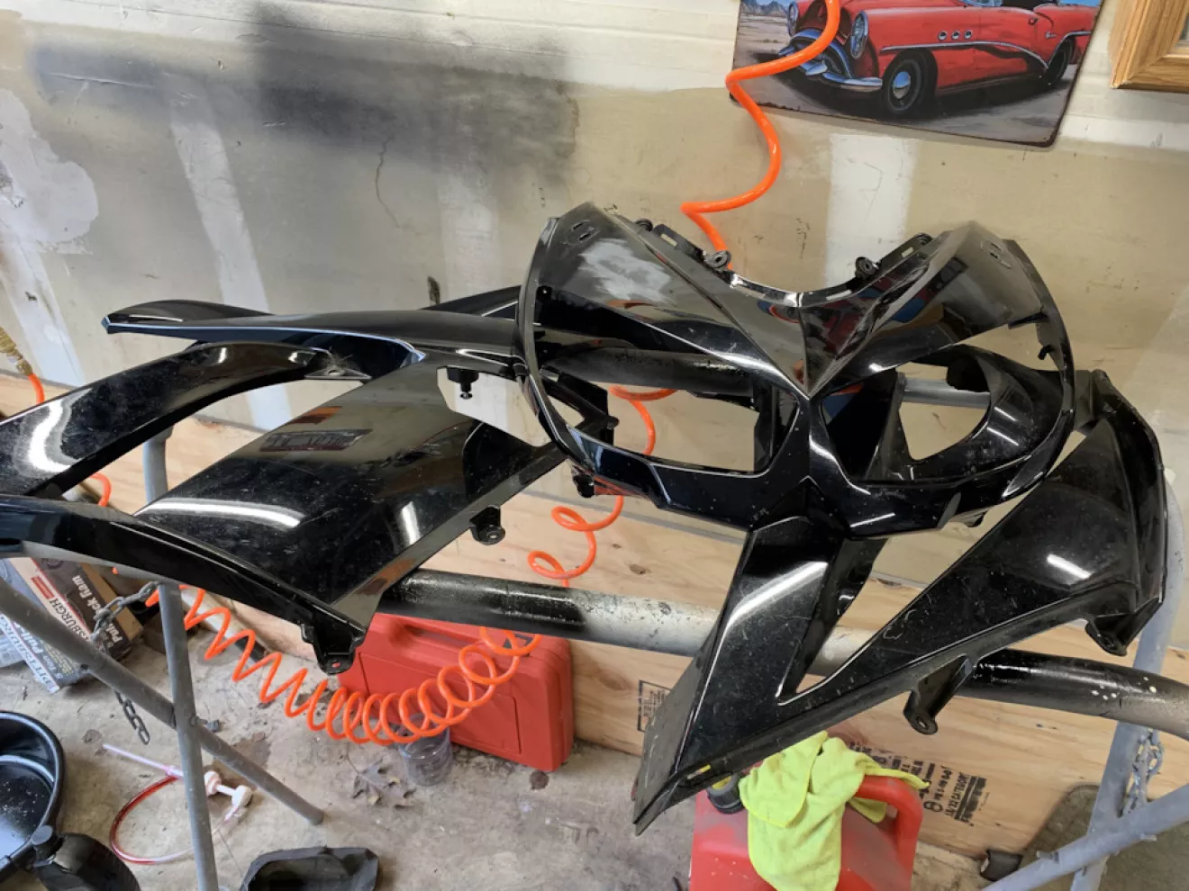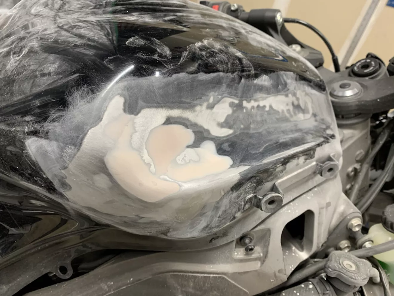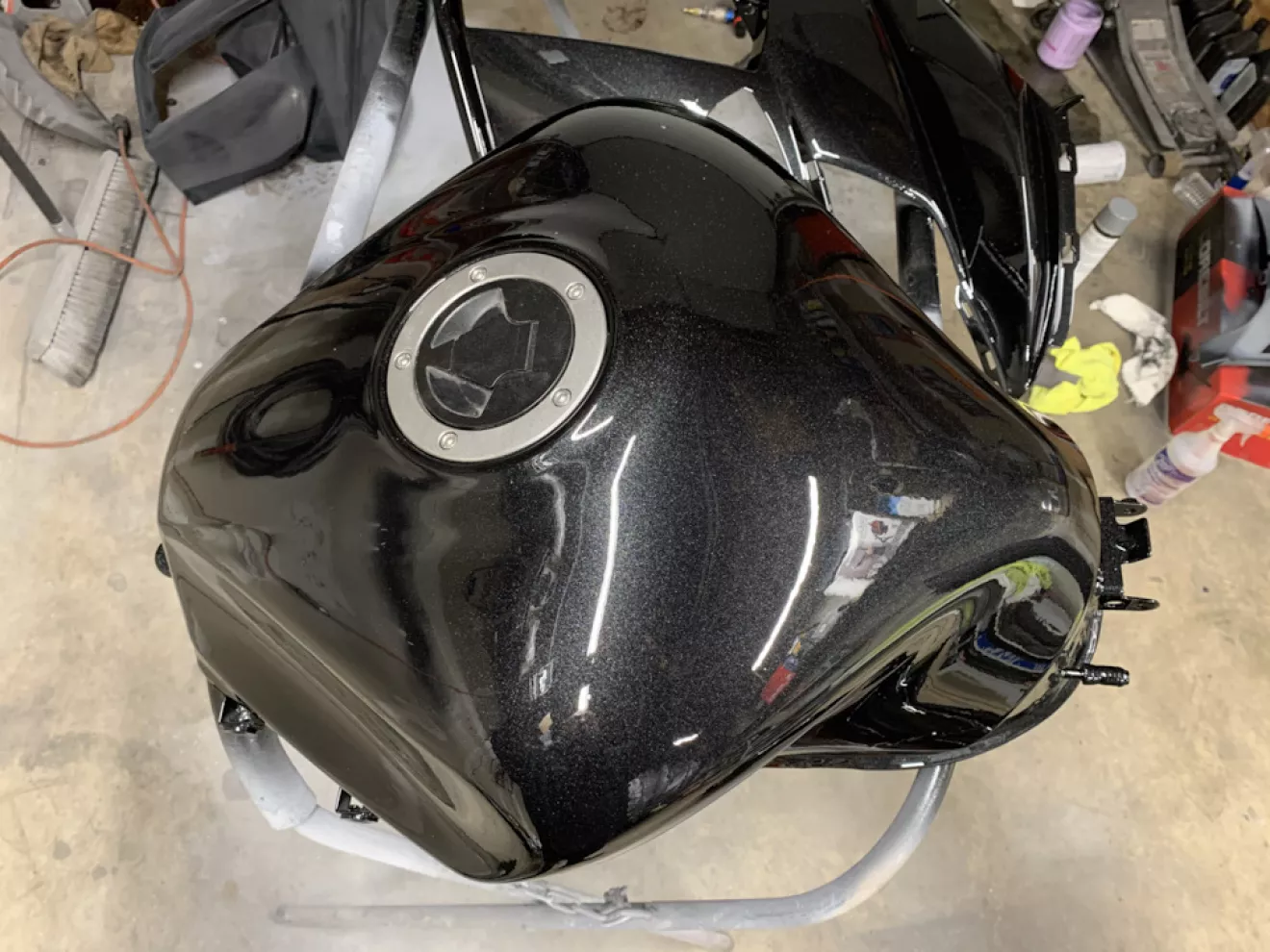 Было пару царапин и вмятина на баке. Так достался от предыдущего хозяина.Долго определялся с цветом, но решил оставить чёрным. Единственное что добавил металлик, а был просто чёрный.