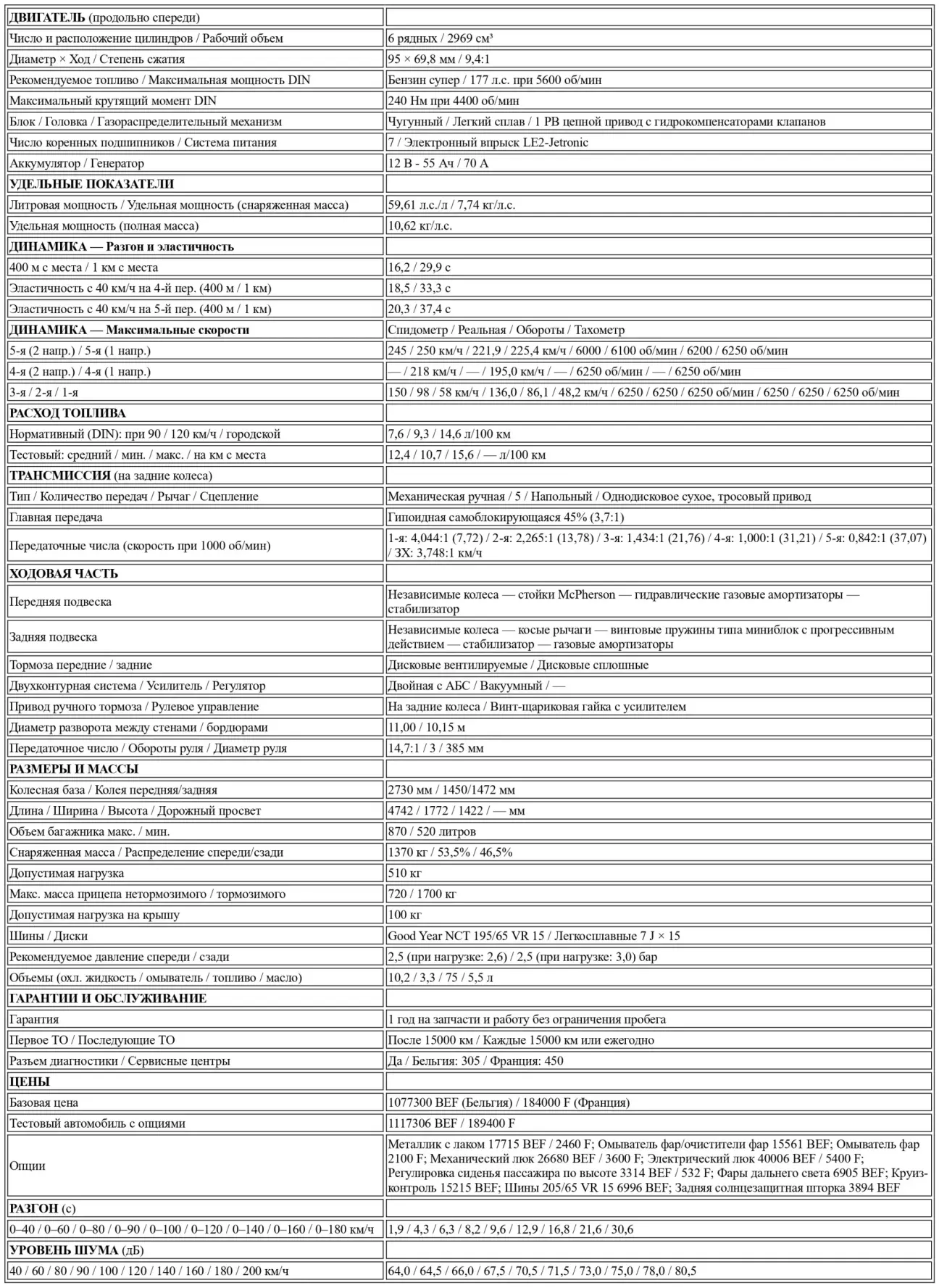 Помимо отличной аэродинамики, решающую роль здесь, несомненно, играет впрыск Bosch LE2-Jetronic и все его вспомогательные системы. Одна только отсечка подачи топлива при сбросе газа позволяет экономить до 5% бензина. Что касается цифр, заявленных производителем (7,6 л/100 км при 90 км/ч и 9,3 л/100 км при 120 км/ч), они кажутся нам очень близкими к реальности, но на модели 3000 трудно ездить с такими скоростями! Отметим, что благодаря баку емкостью 75 литров средний запас хода легко превышает 500 километров.