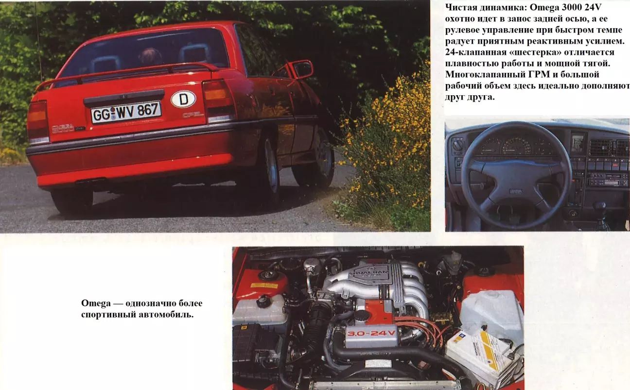 В отличие от Omega, модель 525i внешне выглядит очень сдержанно, без привычных спортивных атрибутов вроде раздутых порогов, глубокого переднего спойлера или высокого заднего антикрыла. И если Omega очень к лицу ее спортивный антураж, то 525i крайне идет ее строгая элегантность. Тот факт, что она никак не подчеркивает внешне свое техническое превосходство над предшественницей в виде новой 24-клапанной головки блока, делает ее в некотором роде «волком в овечьей шкуре»: с максимальной скоростью 232 км/ч эта 2,5-литровая машина входит в число самых быстрых в стране и в этой дисциплине может тягаться даже с 211-сильной 535i. Симпатия, которую вызывает броская Omega, объясняется тем, что она не просто обещает спортивность, но и дает ее почувствовать. Со своими 244 км/ч эта Opel вторгается в скоростную лигу чистокровных спорткаров. При этом характер отдачи мощности трехлитрового мотора не рождает ни малейшего подозрения, что перед вами форсированный гоночный агрегат. Напротив: завидная мощь в сочетании с внушительным крутящим моментом всегда обеспечивают сбалансированную и вовсе не суетливую манеру езды.