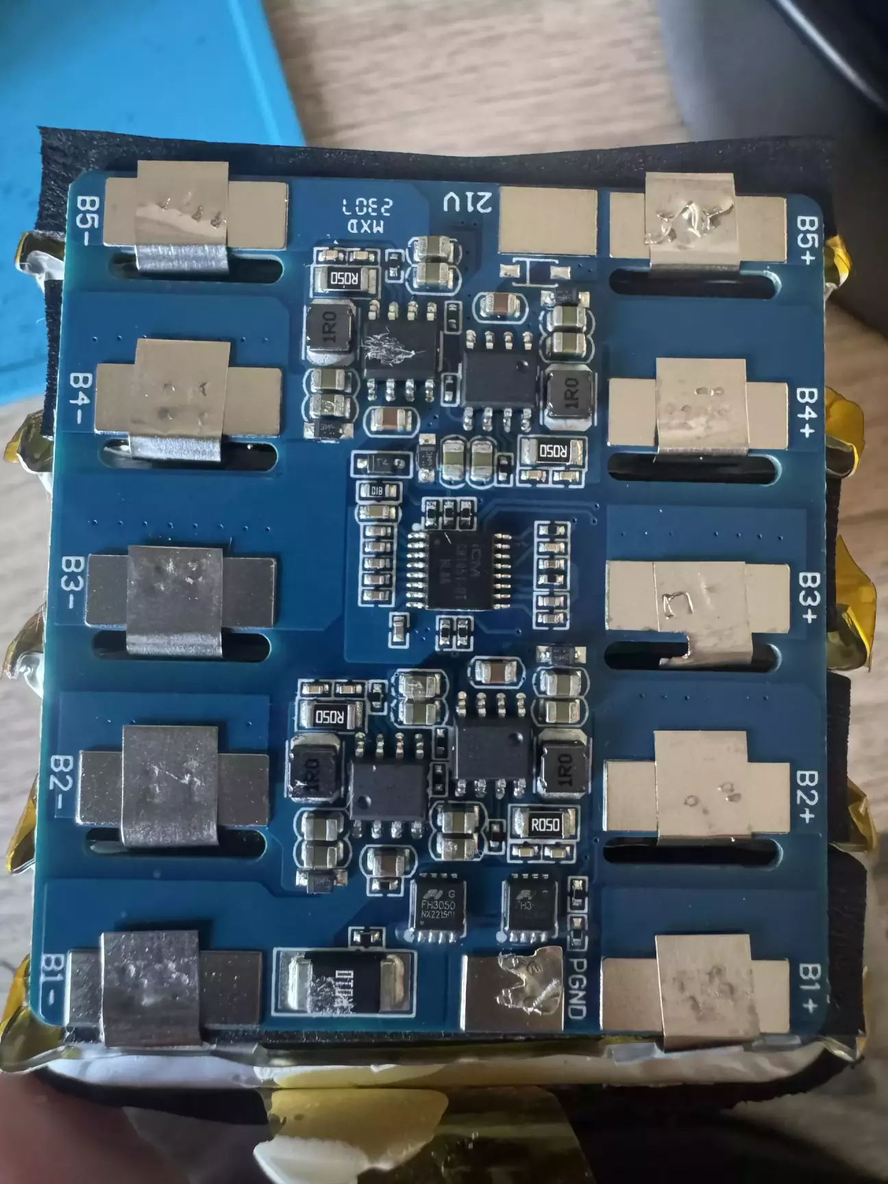 Знявши плату з інтерфейсами бачимо BMS. Все цивільно, є другий датчик температури, що прямо порадувало, але зверніть увагу на третій елемент і його правий контакт. При точковому зварюванні в китайця смикнулась рука і частина електрода відгоріла. Не критично, просто спостереження.