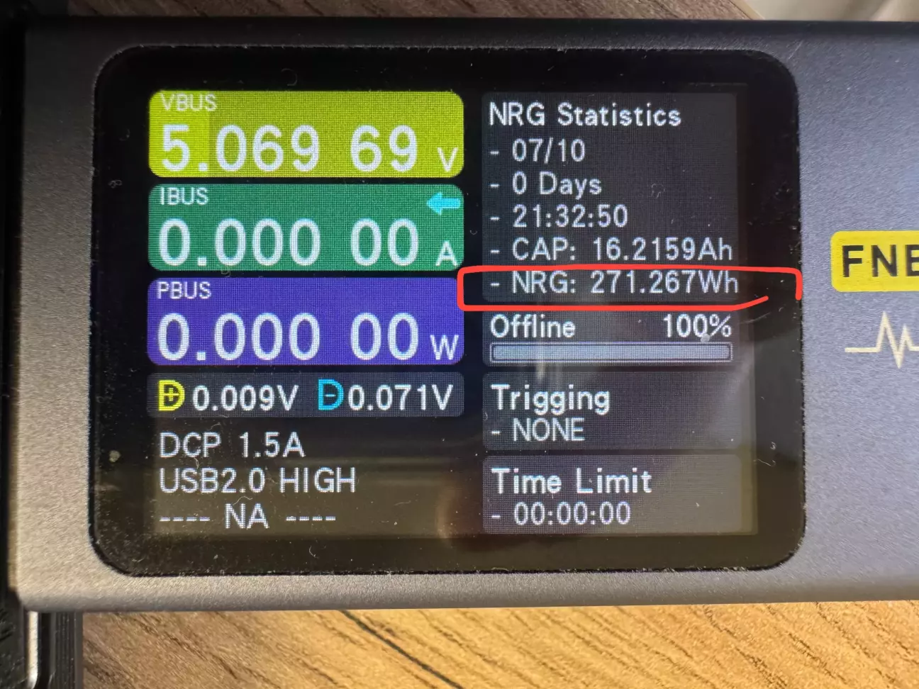 З 0% він пропрацював ще день під навантаженням моєї настільної лампи (16W) і нарешті сів, віддавши 271Wh.