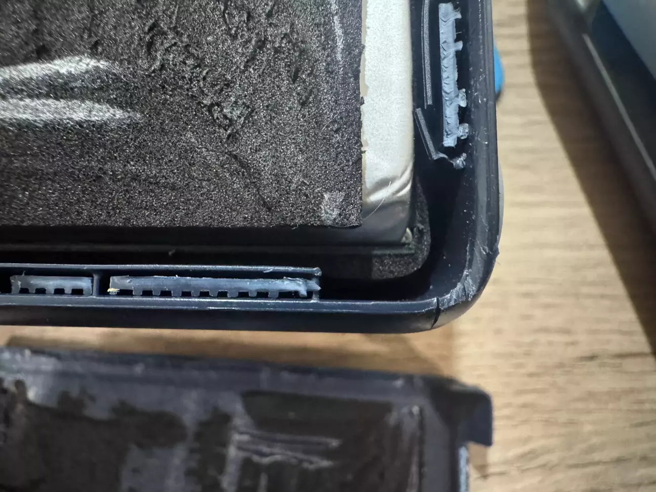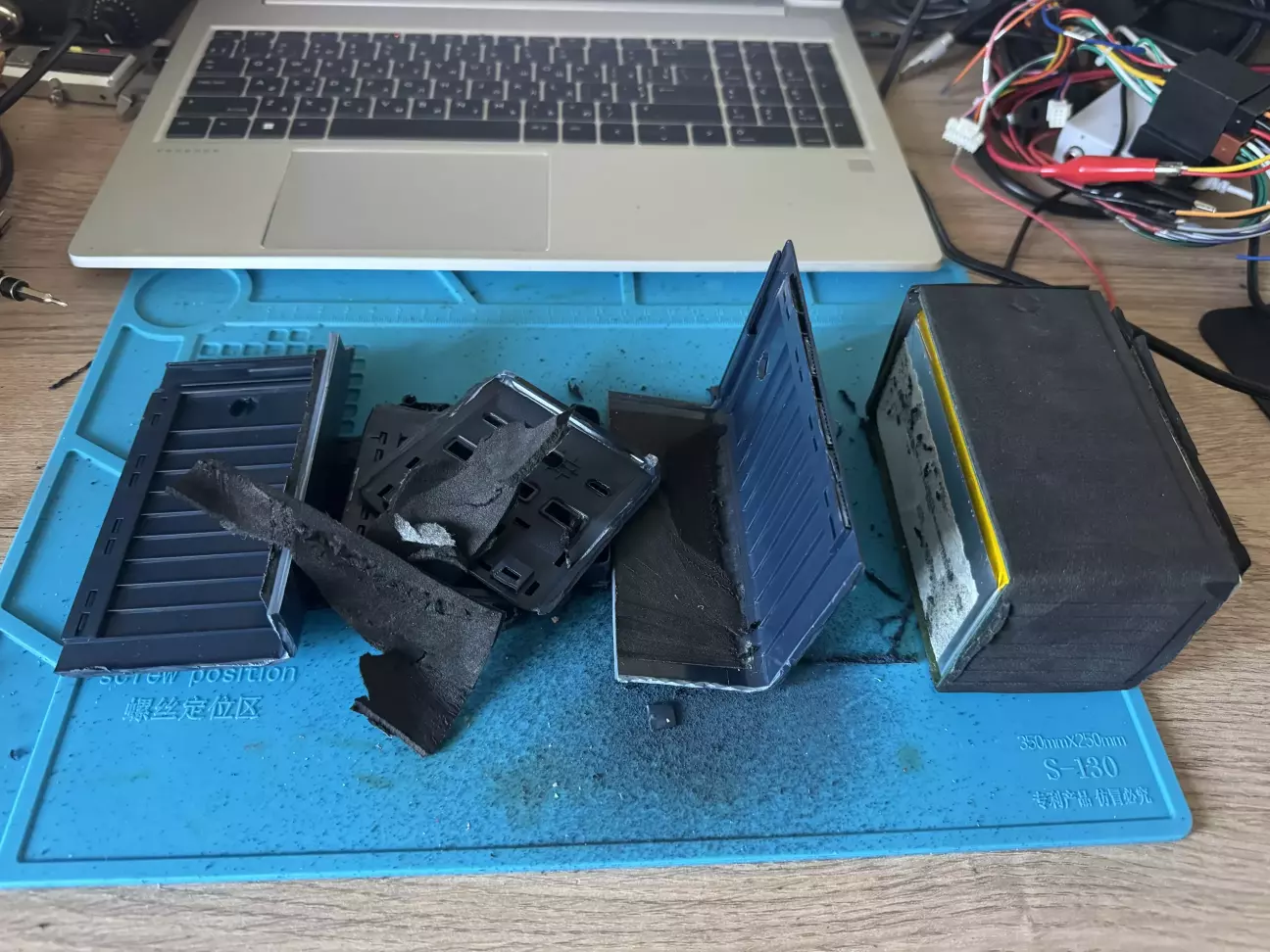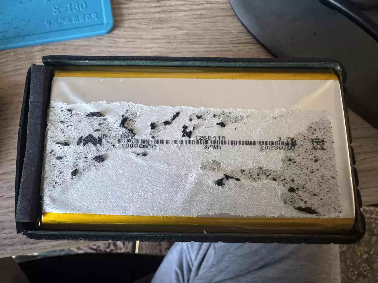 Dremel, канцелярський ніж і вперед. Один невірний рух і може бути пожежа, тому дуже обережно. І ось вона відповідь, чому не піддавався: застібки як в ноутбучних батареях, після закриття кришки відкрити її вже не вийде. На додачу 2-сторонній спінений скотч на всю площу батареї розміром 60х110мм. Спочатку вирізав шматочок над батарейками і потім зрізав всю кришку.