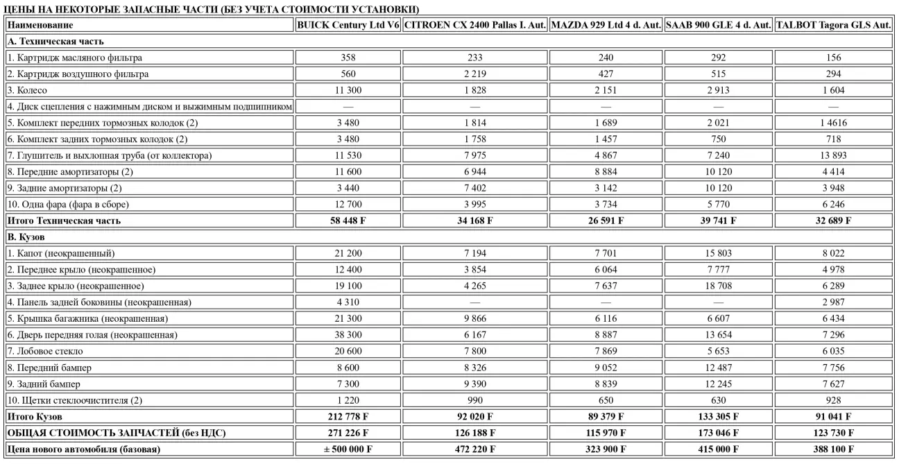 В качестве примера можно немного разобрать цену этого Buick согласно американскому тарифу в долларах, без учета транспортных расходов, ввозных пошлин, конвертации и дилерской маржи. Базовый автомобиль без опций стоил — а речь идет еще о тарифе модели 82 года, тариф 83-го модельного года еще ожидается — 8 000 долларов (по курсу регулируемого рынка, применяемому для импорта, доллар стоил 47,28 франка на 2 сентября). Эта цена соответствует Century Limited 4-door Sedan с автоматической коробкой передач и гидроусилителем руля. К этому нужно сначала добавить комплект «европейских» опций, которые GM устанавливает в обязательном порядке на автомобили, предназначенные для нас. Этот комплект включает 5 ремней безопасности с инерционными катушками спереди (дилерская цена в США в 1982 году: 7,38 $), тонированные стекла и электрообогрев заднего стекла (многослойное лобовое стекло — в базе — 220,58 $), регулируемый прерывистый режим стеклоочистителей (38,54 $), два наружных зеркала с регулировкой из салона (36,90 $), консоль-подлокотник с боксом между передними сиденьями (82,00 $), регулируемую рулевую колонку (77,90 $), радиальные шины размерности 185/80 (100,04 $), европейские фары (87,74 $), европейские задние фонари (80,36 $), европейский звуковой сигнал (12,30 $), спидометр и одометр в километрах (14,76 $), специальные рамки для бельгийских номерных знаков (8,20 $), буксировочный крюк (18,04 $).