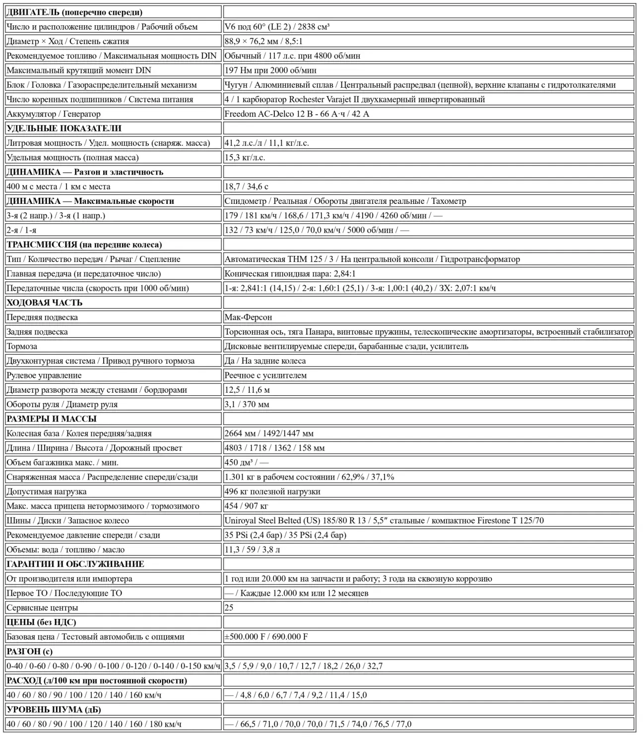 Комфорт американских автомобилей легендарен. Инженеры GM, естественно, сделали все, чтобы сохранить его, одновременно снизив вес, и им это вполне удалось. Подвеска «европейского типа», установленная на этой экспортной модели, соответствует тому, что американцы называют heavy-duty, но она все еще достаточно хорошо разглаживает дорогу, кроме неровностей определенной амплитуды. Последние отзываются довольно... звучными ударами, от которых пассажиры, впрочем, все еще хорошо изолированы благодаря переднему подрамнику (изоляция которого, естественно, также способствует недостатку информации у водителя). Вы слышите и, возможно, видите результат этих ударов. В повороте на неровном покрытии, например, передняя ось может совершить небольшой прыжок в сторону из-за амортизации, все еще несовершенной по европейским критериям.