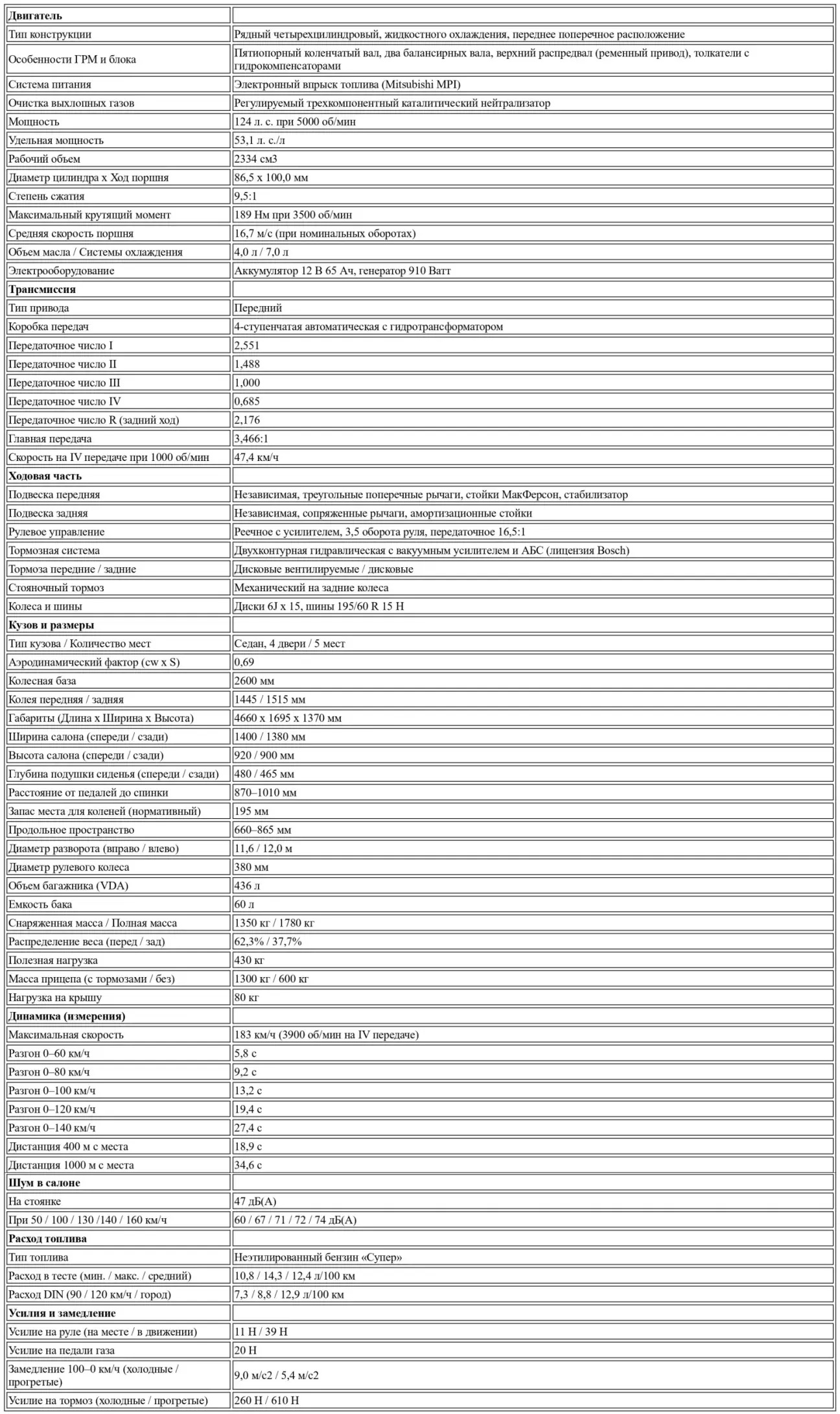 Столь же незаметно регулируется микроклимат. Кондиционер, разумеется, тоже с электронным управлением, поддерживает однажды выбранную температуру неизменной — без досаждающих сквозняков или шума вентилятора. Двигатель даже при полной отдаче мощности оказывается тихоней. Четырехцилиндровый мотор, оснащенный двумя балансирными валами, хоть и не является образцом азарта при наборе оборотов, убеждает хорошей культурой хода и приятной характеристикой мощности. Из 2,4 литров рабочего объема инжекторный двигатель, серийно оснащенный катализатором, выдает 124 л. с. и обеспечивает максимальный крутящий момент 189 Нм при 3500 об/мин.