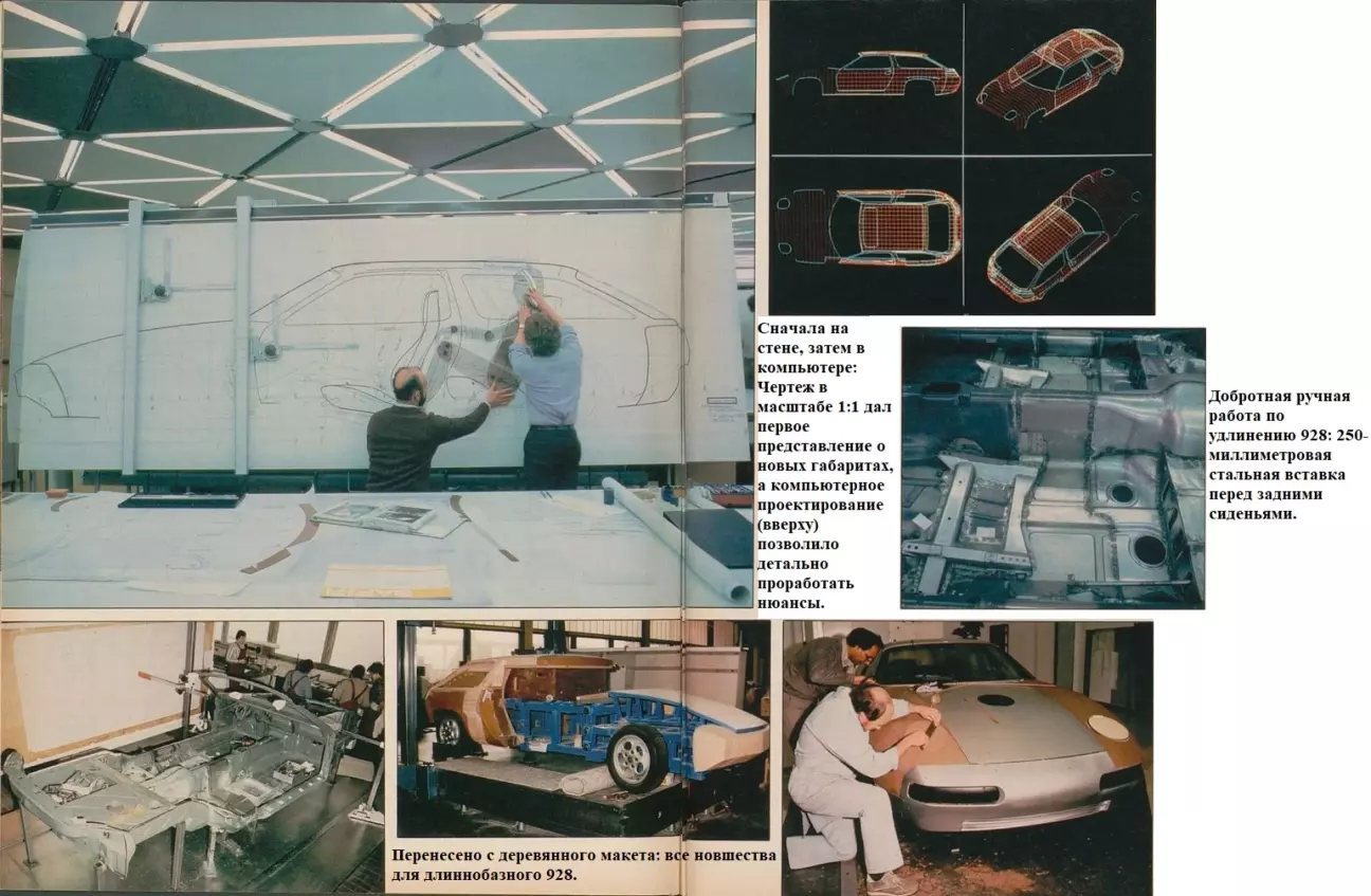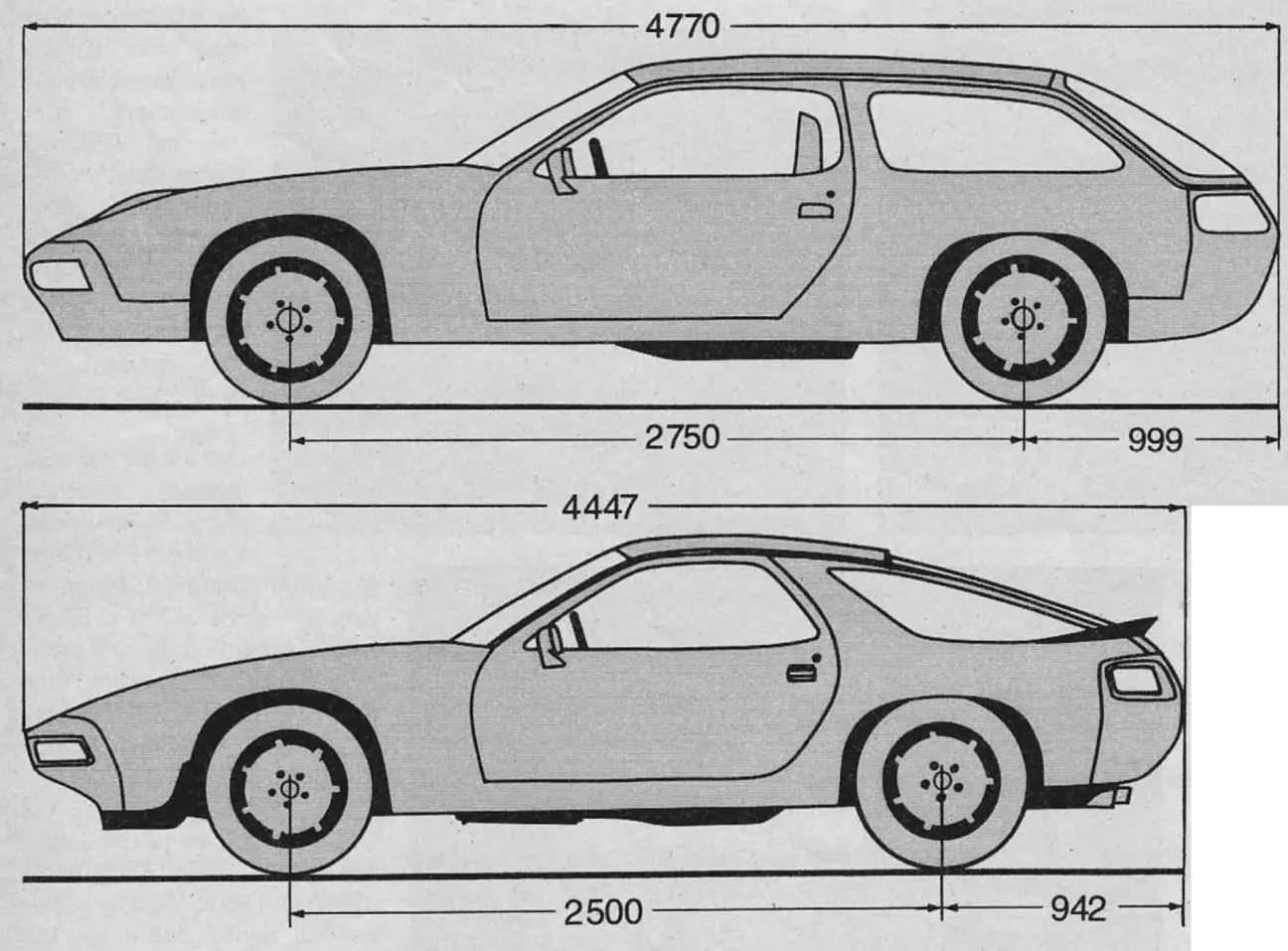 При постройке этого уникального экземпляра специалисты цеха прототипов исследовательского центра Porsche в Вайзахе удлинили основание кузова серийного 928 S ровно на 250 миллиметров. Кузовной остов подвергся растяжке непосредственно «перед зоной установки задних сидений», как на заводе называют две маленькие чаши кресел в корме 928. Новая задняя часть салона теперь в большей степени заслуживает этого названия, так как всё удлинение пошло исключительно на пользу пространству для ног задних пассажиров. Чтобы обеспечить им не только удобную посадку, но и комфортный вход-выход, инженеры предприняли дополнительные усилия. Стойку B выпрямили на 90 миллиметров, а рамка дверного окна, которая на серийной модели сильно завалена вперед, теперь стоит почти вертикально в районе центральной стойки — благодаря этому проскальзывание на задние ряды больше не представляет серьезной проблемы.