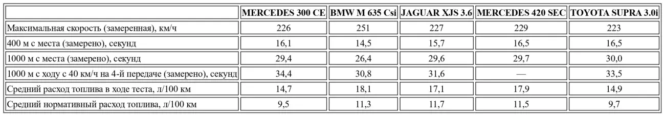 Как и прежние модели, новые купе Mercedes предлагают четыре полноценных места, что является редким качеством для автомобилей такого типа. Из-за своего относительно спокойного темперамента 230 и 300 CE фактически не имеют прямых конкурентов. Так, для рассматриваемого здесь 300 CE прямым соперником мог бы стать BMW 628 CSi, но тот снят с производства еще в апреле. В ожидании новой 6-й серии и новой модели Opel — а это случится не завтра — можно было бы с большей уверенностью рассчитывать на скорое появление купе Honda Legend для организации дуэли. На данный момент наши сравнительные таблицы выглядят довольно разношерстно: тут и сверхмощный BMW M 635, и консервативный Jaguar XJS 3.6, и старший брат Mercedes 420 SEC, и экзотическая Toyota Supra 3.0i. Последняя выглядит несколько чужеродно в этом аристократическом собрании; мы бы предпочли включить сюда Volvo 780, но та еще не проходила подробных испытаний в нашей редакции.