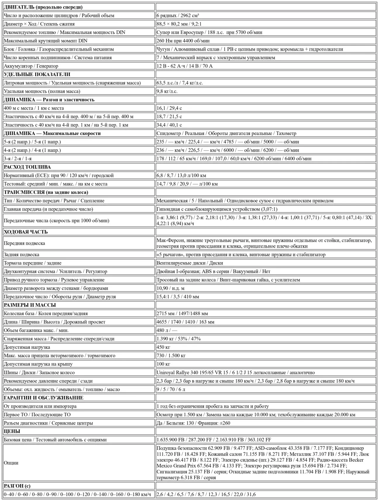 Шестицилиндровый агрегат появился вместе с седаном 300 E в 1985 году. Он нам хорошо знаком и славится, в частности, тишиной работы, эластичностью на всех режимах и умеренным аппетитом при такой отдаче. С момента своего появления он, тем не менее, претерпел ряд изменений, коснувшихся электронного управления механическим впрыском и электронного зажигания. Благодаря новым настройкам с середины прошлого года он способен без разбора потреблять как бензин «супер», так и неэтилированный «евросупер». В случае необходимости он может довольствоваться даже обычным неэтилированным бензином ценой снижения характеристик и роста расхода. В этом случае предварительно потребуется изменить настройки питания и зажигания с помощью переключателя под капотом. Эти новые базовые настройки несколько изменили его характеристики по сравнению с седаном, который мы тестировали в 85-м. Мощность со 190 л. с. при 5600 об/мин была слегка снижена до 188 л. с. при чуть более высоких 5700 оборотах. Значение максимального крутящего момента по-прежнему составляет 260 Нм, но теперь он достигается при 4400 об/мин против 4250 ранее. Обороты высоковаты, учитывая назначение автомобиля, ориентированного скорее на комфорт, нежели на рекорды. Поскольку вдобавок этот двигатель скован слишком «длинной» трансмиссией, он разочаровывает на низких и средних частотах вращения, а точнее — ниже 4000 оборотов. В таких условиях V6 Alfa или 2,8-литровый PRV — оба в паре с грамотно подобранными коробками передач — проявляют себя куда более ярко. Этот недостаток тяги, откровенно мешающий при работе с 5-ступенчатой КПП, тем не менее не портит его мягкую, плавную и бесшумную работу без намека на вибрации.
