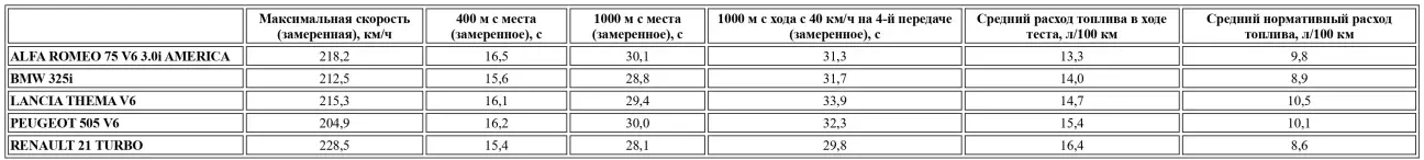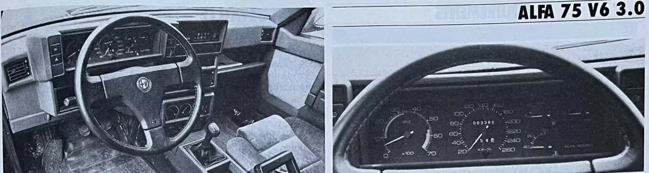 При вполне средней удельной мощности — 63,5 л.с./л, но при отношении веса к мощности в снаряженном состоянии 6,64 кг/л.с., 75 V6 3.0 безоговорочно входит в число высокодинамичных седанов. Завод заявляет максимальную скорость 220 км/ч и ускорение в стиле «пушечного выстрела»: от 0 до 100 км/ч за 7,3 с и километр с места за 28 с; показатели, которые нам не удалось повторить на тестовом автомобиле. Объяснение, вероятно, кроется в том, что предоставленная в наше распоряжение 75 была относительно «молодой» (едва 4000 км на одометре во время замеров), а всем известно, что Alfa должна как следует прикататься (порядка 8000–10 000 км), чтобы раскрыть весь свой потенциал. В стремлении оперативно информировать читателя и учитывая довольно позднее появление 75 V6 в пресс-парке бельгийского импортера, порой бывает трудно совместить... несовместимое. 75 V6 определенно способна на большее. В связи с этим мы можем лишь посоветовать вам заглянуть в номер 876 журнала MA от 25 июня 87 года, где 75 V6, полученная напрямую из пресс-службы завода, показала гораздо лучшие результаты в ходе сравнительного теста с другими спортивными моделями.