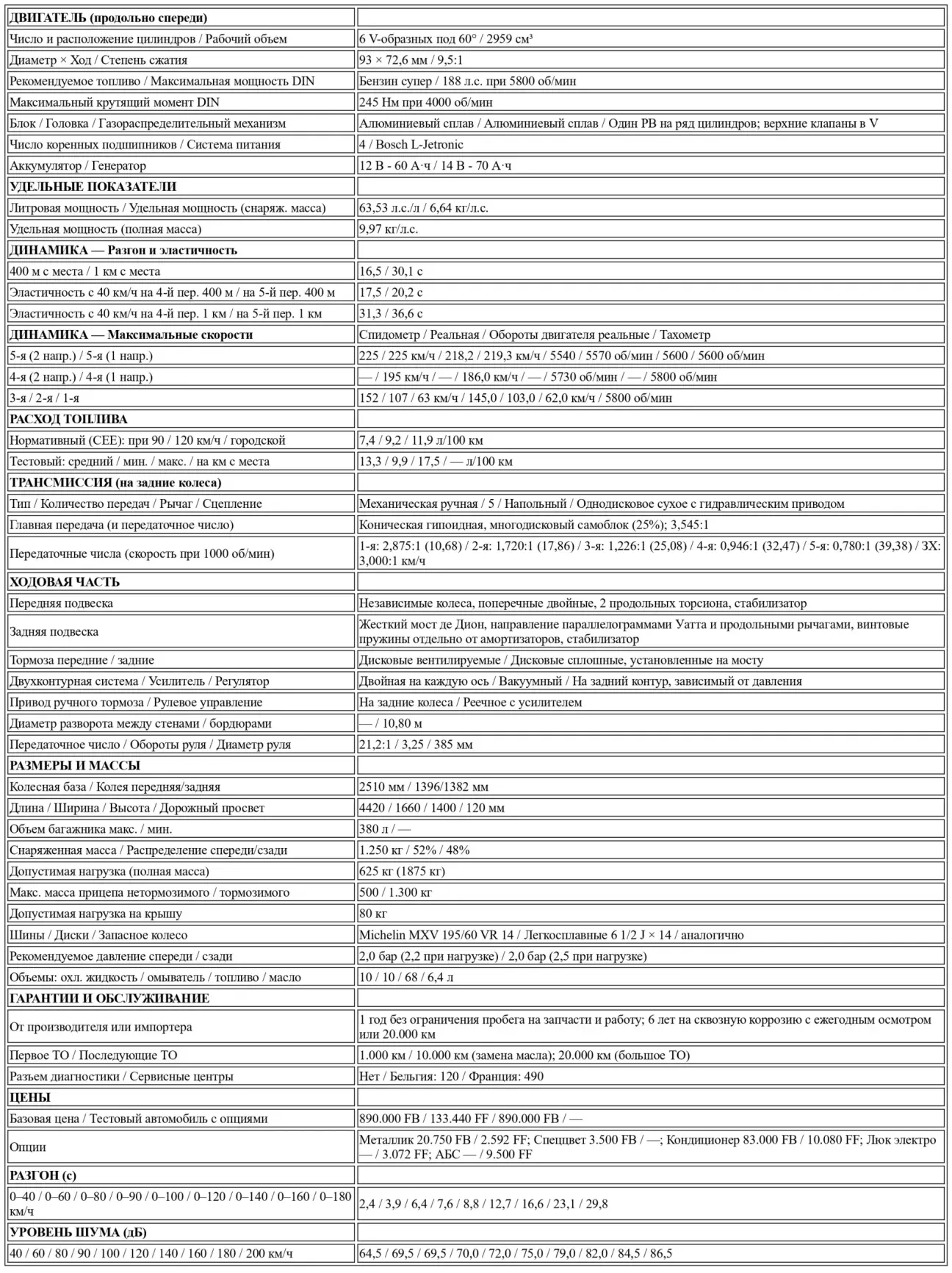 ДОСТОИНСТВА: Великолепный двигатель V6. Темперамент и эластичность во всем диапазоне оборотов. Умеренный расход топлива. Подбор передаточных чисел. Очень точный гидроусилитель руля. Качественное торможение. Весьма надежная управляемость. Автомобиль с характером, богатое серийное оснащение, привлекательная цена.