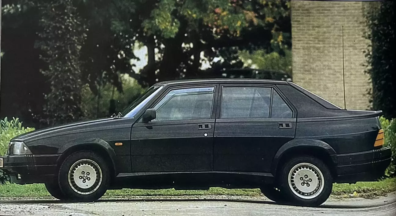 Четыре крупных диска (передние — вентилируемые), традиции соблюдены — это истинная Alfa. Узлы заимствованы у моделей 1800 Turbo и 2500 Quadrifoglio Verde. Система включает двухконтурный гидравлический привод (по одному на каждую ось), вакуумный усилитель, а также регулятор давления, воздействующий на задние колеса в зависимости от нагрузки. В итоге площадь тормозных механизмов должна позволять справляться с самыми жесткими ситуациями. Задние диски расположены у дифференциала для снижения неподрессоренных масс. Несмотря на ощущение некоторой мягкости и довольно глубокий ход педали, тормоза соответствуют темпераменту двигателя. Они оказываются весьма мощными и при этом обладают отличной способностью к восстановлению после интенсивной нагрузки. Конечно, при резком замедлении автомобиль имеет тенденцию «клевать» носом, но блокировка колес происходит очень поздно. Для активных водителей ABS вовсе не обязательна; она адресована скорее тем, кто ищет большего комфорта и безопасности в любых условиях. Эта система ABS производства Bosch должна быть предложена в качестве опции с января 88 года в Бельгии, тогда как на французском рынке она уже широко представлена. На протяжении всего теста тормоза нас полностью устраивали, за исключением индикатора износа колодок, работающего совершенно непредсказуемо. Завершим этот раздел упоминанием нелепой формы и хода рычага стояночного тормоза: он игнорирует эстетические чувства публики и, похоже, намерен существовать долго. При этом он довольно эффективно блокирует задние колеса — и на том спасибо!