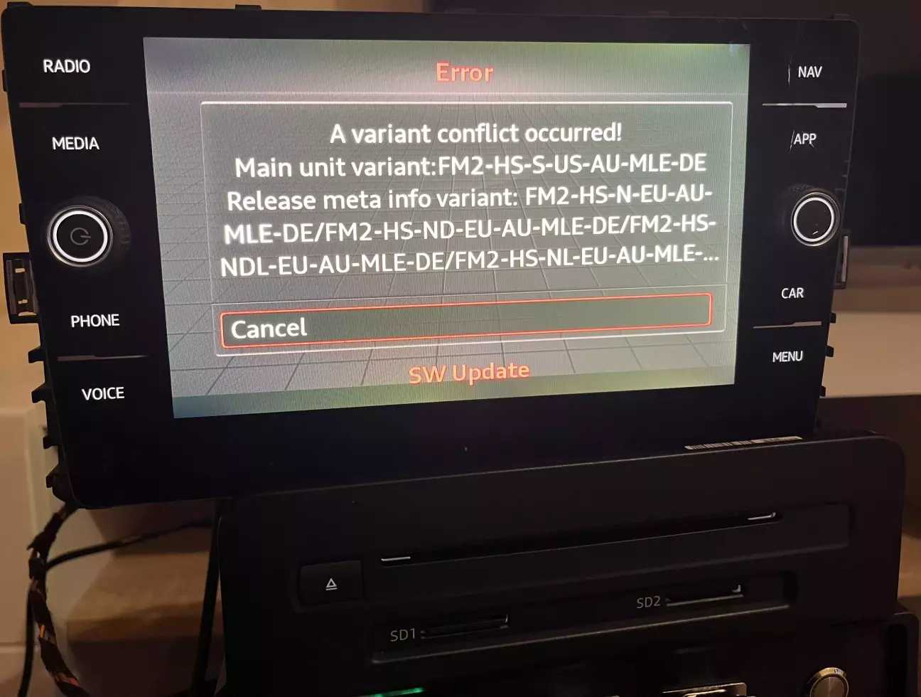 6. Вставити карту SD в MIB і спробував встановити прошивку, щоб отримати помилку і дізнатися, який варіант має цей юніт (в моєму випадку FM2-HS-S-US-AU-MLE-DE), ще одним простішим способом дізнатись варіант, про який я дізнався пізніше, є встановлення версії логотипів радіостанцій: