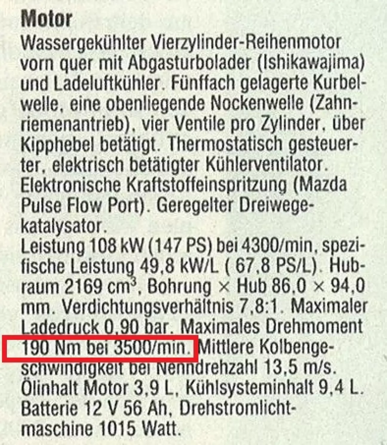 Данный тест интересен тем, что тут представлена машина от "серого" немецкого дилера в американской спецификации. Ещё деталь, что в тексте и в финальной таблице немцы приводят значение крутящего момента как 190 Нм. Я уже как-то был проглядел такое, а тут что-то бросилось в глаза слишком малое значение как для турбо. Посмотрел на вики (не самый надёжный источник, да, но тут нужны были другие данные). Действительно, там 190, но в lb⋅ft, а в Нм — это 258. Видимо, редакция пропустила эту деталь и в верстку пошли американские цифры. И на вики, кстати, также есть упоминание отдельно о двигателе, что значения его показателей намеренно занижены, а в тесте немцы как раз задают этот же вопрос, так как динамика явно превосходит заявленные значения мощности. Могли б и на стенд уже кинуть машину, чтобы удостовериться и развеять мифы, но почему-то этого не сделали.
