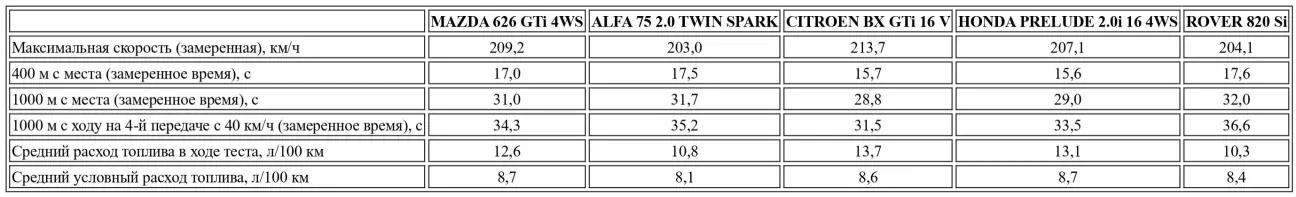 Замеры подтвердили отличные впечатления. Наш автомобиль превысил заявленную заводом максимальную скорость, достигнув 209,2 км/ч (среднее значение в двух направлениях) при паспортных 205 км/ч; двигатель при этом раскрутился до 6300 об/мин, что на 300 об/мин выше режима максимальной мощности. Динамика 626 GTi блестящая, по крайней мере, она оставляет самое лучшее впечатление. По секундомеру предоставленный нам автомобиль достиг скорости 100 км/ч с места менее чем за 10 секунд (9,6, если быть точным); на преодоление километра ушло 31,0 с, а отметку 400 м машина прошла через 17,0 с. Безусловно, другие седаны спортивной направленности могут быть быстрее, но факт остается фактом: Mazda 626 GTi 4WS легка в управлении, азартна и эластична. Эластична, как показывают результаты наших замеров на добор скорости. На графиках зафиксирована высокая величина момента на любых оборотах. На пятой передаче кривая принимает прямолинейный характер от 40 до 144 км/ч; на четвертой двигатель сразу демонстрирует суперформу, лишь слегка сдавая позиции после 120 км/ч (выше 4200 об/мин). Результаты в этом тесте отнюдь не смехотворны: потребовалось 34,3 с, чтобы проглотить километр на четвертой передаче при старте с 40 км/ч (скорость на финише составила 164 км/ч), и это время увеличивается всего на 4 секунды (38,6 с) на пятой передаче (скорость 144 км/ч на отметке 1000 м).