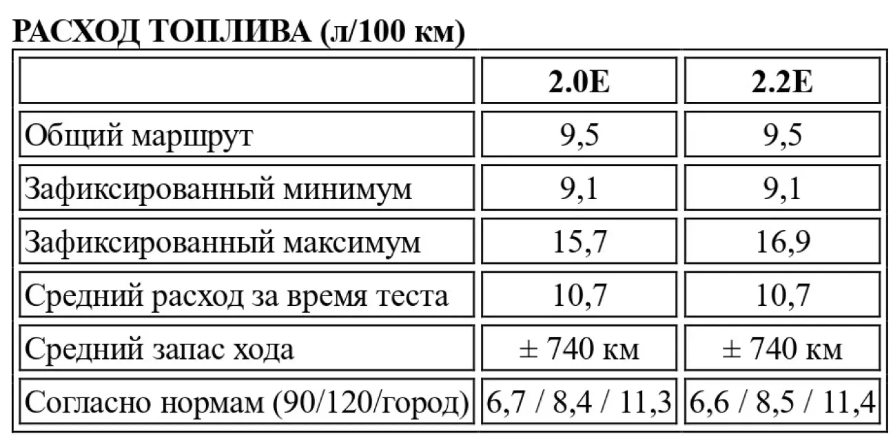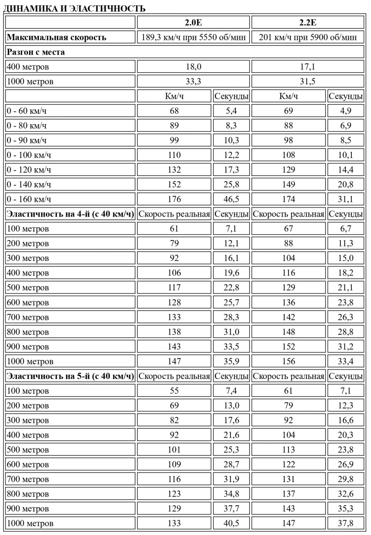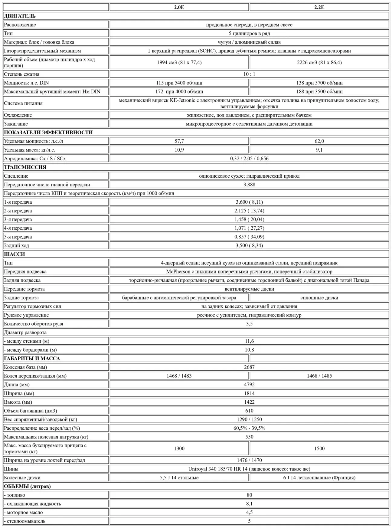 С грехом пополам настроенный на отдачу на низких и средних оборотах, агрегат объемом 1994 см³ выдает свою меньшую мощность (115 л.с. при 5400 об/мин) и более слабый крутящий момент в 172 Нм при 4000 об/мин по сравнению с эффективным мотором 2226 см³, предлагающим 138 л.с. при 5700 об/мин и, что важнее, 188 Нм уже при 3500 об/мин. За рулем 2.0E водитель будет страдать как от недостатка "мяса" на низах, так и от отсутствия задора на верхах. К слову, прохождение километра с места более чем за 33 секунды и максимальная скорость, не превышающая 190 км/ч при столь обтекаемом кузове — такого в клане двухлитровых инжекторных седанов не видели давно. Поскольку в диапазоне от 3000 до 5000 об/мин некая бодрость все же ощущается, показатели эластичности (36 с на четвертой и 40,5 с на пятой при разгоне с 40 км/ч до километровой отметки) все же не столь катастрофичны, как у аморфной Fiat Croma 2.0i, вялого Scorpio 2.0i или ленивого Saab 9000i на низких и средних оборотах. Тем не менее, 2.2E легко доказывает свое превосходство. В цифрах: максималка за 200 км/ч, 31 с половиной секунда на километре с места, а в упражнениях на эластичность она и вовсе уходит в отрыв (33,4 с на четвертой и менее 38 с на пятой), выступая на равных с самыми эластичными двухлитровыми моторами современности — от Renault 25 TX и Opel Omega 2.0i. На деле же: беспрекословно отвечая на любое нажатие акселератора вне зависимости от профиля дороги, инжекторный двигатель 2.2 с легкостью тянет 1300 кг, позволяя совершать обгоны в любых условиях и охотно крутясь, когда это нужно. Глядя на столь полнокровный агрегат, бодрый как при 2000, так и при 6000 об/мин, одна лишь мысль о том, что скоро его придушит катализатор, вызывает недоумение. Таким образом, до 89-го года стоит в полной мере наслаждаться этим комфортным запасом тяги, позволяющим — куда лучше, чем на 2.0E — вести машину быстро и плавно.