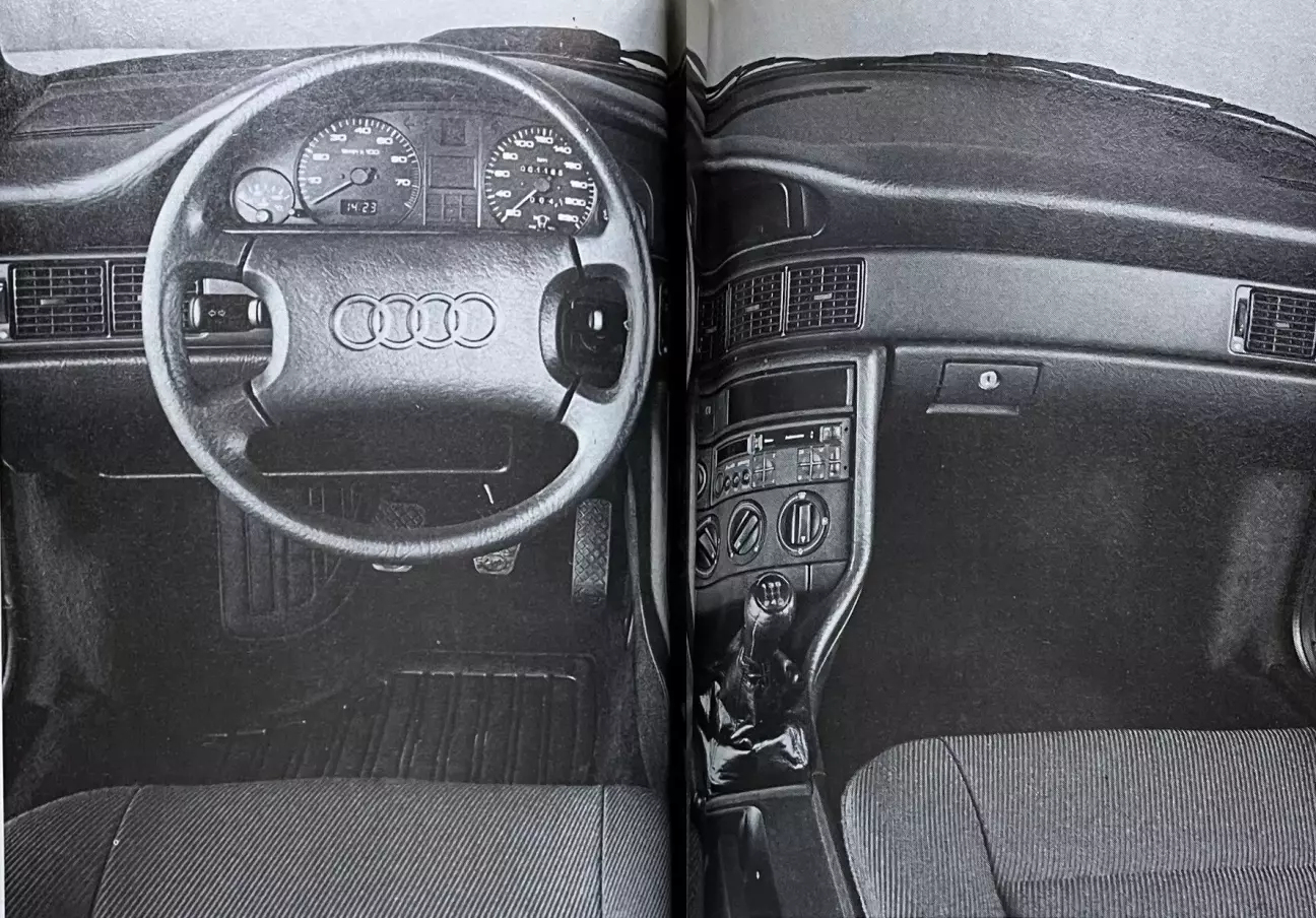Пять цилиндров — главная оригинальность 100 и Audi в целом (наряду с системой полного привода Quattro). Техническая особенность: Audi — единственный производитель, выпускающий моторы с 5-ю цилиндрами (видимо, автор забыл о других производителях в 1988-ом году или в тексте опечатка — прим. перев.). Особенность чисто практическая: работа, звук и характер пятицилиндрового двигателя уникальны в своем роде. Нам сегодня хорошо известны все плюсы и минусы этой гибридной концепции, занимающей нишу между 4 и 6 цилиндрами. Среди отрицательных сторон напомним о грубости работы, особенно на холостом ходу, когда вибрации отчетливо передаются на кузов и через сиденья, об определенной лености при наборе и сбросе оборотов и, наконец, о довольно трудоемком пуске (как на холодную, так и на горячую, несмотря на внедренную систему принудительной вентиляции форсунок). В активе же первым пунктом идет звучание: ни с чем не сравнимое, оно само по себе создает всю атмосферу Audi 100 и в сочетании с азартным и в то же время эластичным характером инжекторной пятерки формирует то ощущение благородства и изысканности, которое так умеют культивировать седаны из Ингольштадта. Это акустическое удовольствие доступно уже при 2000 об/мин с педалью в пол. Не требуется ни долгих объяснений, ни огромных пробегов, чтобы заметить: приоритет в этих моторах отдан тяговитости и гибкости — ускорения с 1500 об/мин даже на пятой передаче происходят плавно и без рывков, хотя и с очень разным напором в зависимости от того, идет ли речь о двух литрах или о два два.