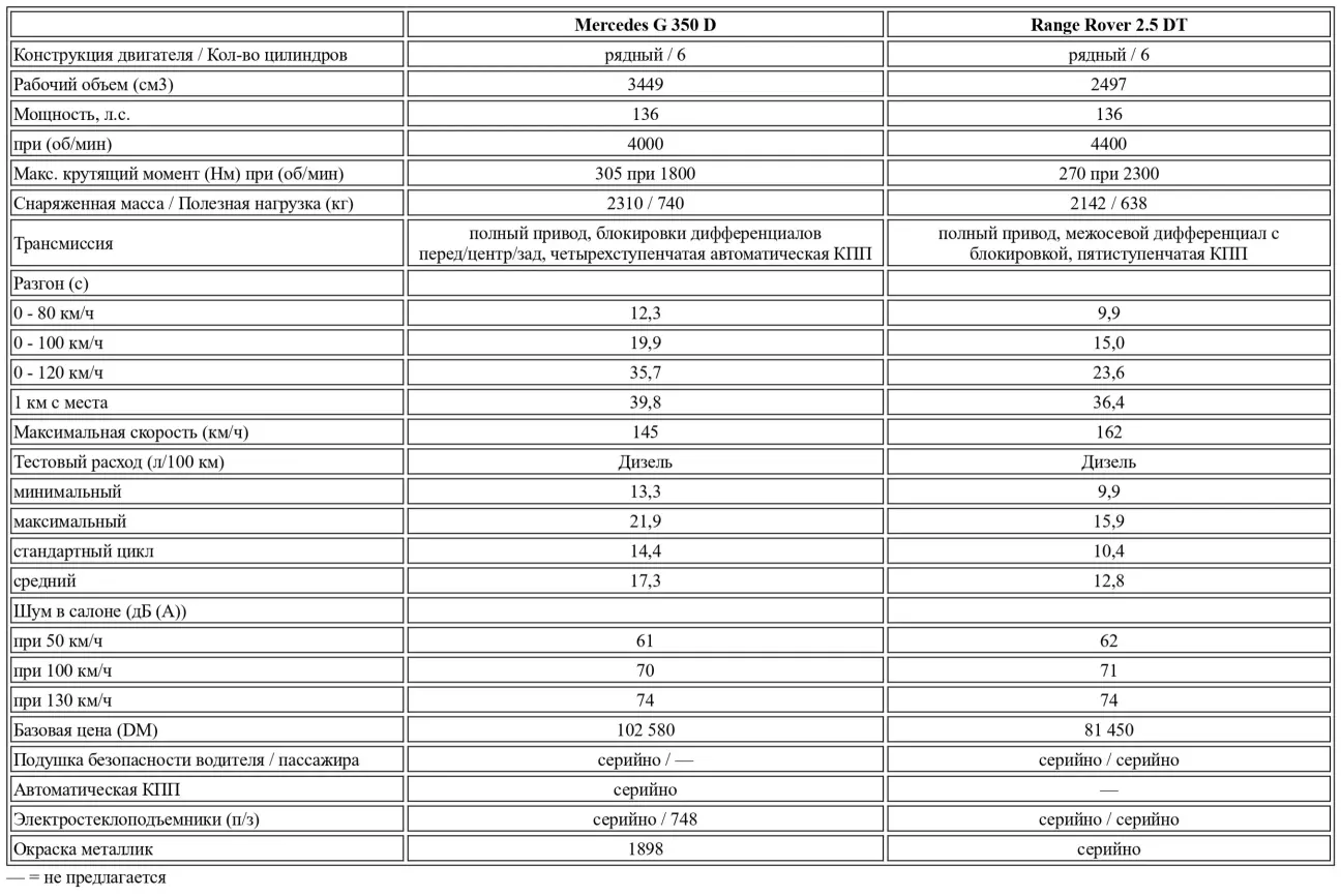 В то время как Mercedes пришлось позаимствовать 136-сильный 3,5-литровый турбодизель у S-класса, чтобы обеспечить тяжелому внедорожнику (снаряженная масса 2310 кг) достойный, но не слишком прожорливый силовой агрегат, в Rover обратились к 2,5-литровой «шестерке» из моторной гаммы материнского концерна BMW. Даже при том, что баварский турбодизель имеет на целый литр меньший рабочий объем, он не уступает конкуренту в максимальной мощности (136 л.с.). Показатели максимального крутящего момента (Rover: 270 Нм при 2300 об/мин, Mercedes: 305 Нм при 1800 об/мин) не давали повода ожидать, что Rover сильно отстанет от G-Modell в динамике.