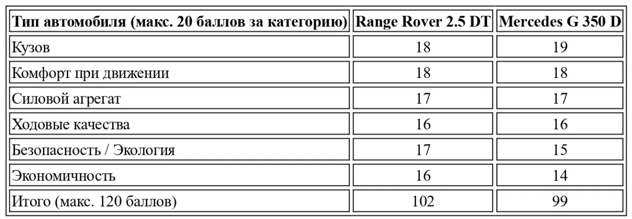 Mercedes страдает здесь не только от лишних 170 килограммов снаряженной массы. Роль играет и тот факт, что в распоряжении водителя Rover имеется пятиступенчатая механическая коробка передач (хотя и не с самым четким механизмом переключения), в то время как Mercedes оснащен стандартным четырехступенчатым автоматом. По максимальной скорости Range (162 км/ч) также деклассирует G-класс (145 км/ч).
