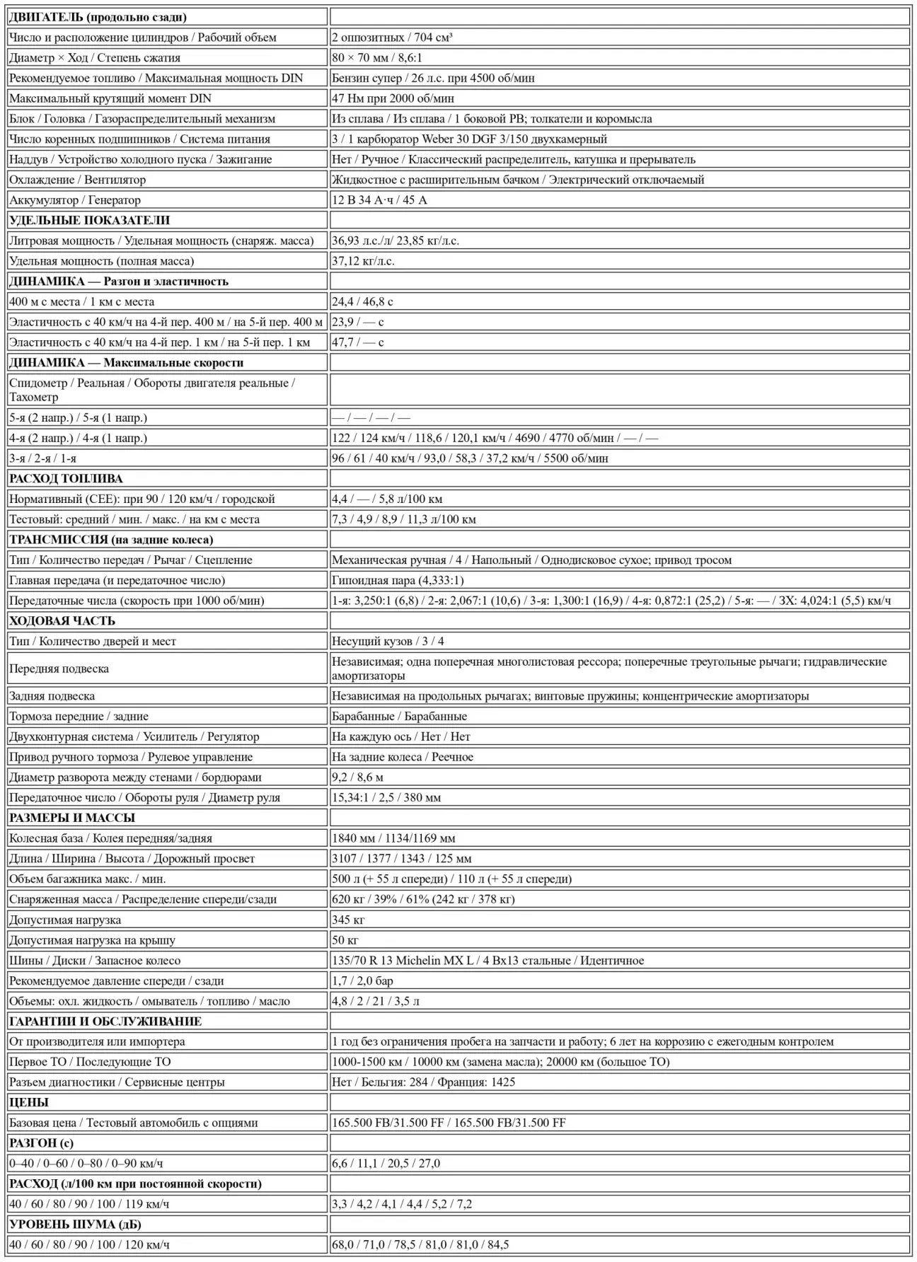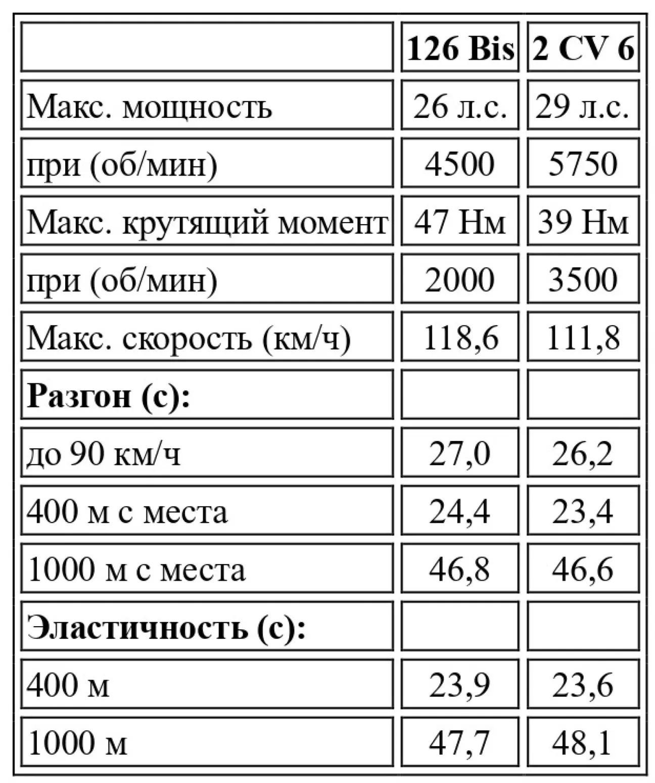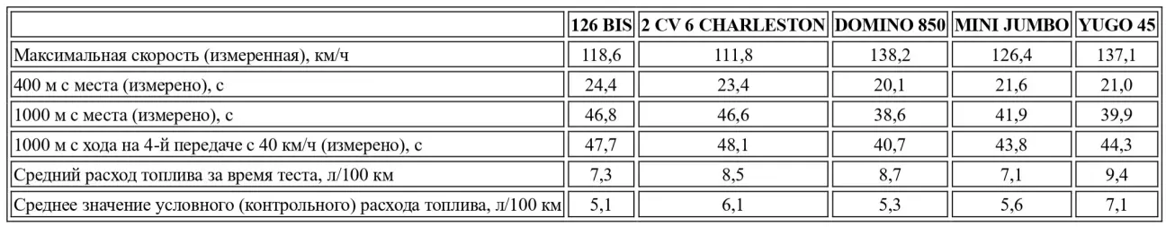 Конечно, мы могли бы быть очень критичными и напомнить, что какой-нибудь литровый или 1300-кубовый мотор едет куда лучше. Однако мы считаем, что нужно оценивать автомобиль адекватно и сравнивать сопоставимые вещи. Вспомним Citroën 2 CV, например — самый малокубатурный автомобиль на рынке, стоящий на ступень ниже... 126 Bis! Кстати, мы оценили малую инерционность подвижных частей двигателя, которая значительно ниже, чем у оппозитного мотора Citroën. Это делает управление более мягким и гармоничным, даже когда мотор «подстегивают» для достижения максимума. Впрочем, француз не проигрывает 126 Bis вчистую. В наших руках 2 CV 6 Charleston (585 кг против 620 кг у 126 Bis) показал ту же динамику, а иногда и большую живость, за исключением максимальной скорости. Причин тому две: мощность Citroën выше (29 л.с.), а инерция оппозитной «двойки» при случае помогает при разгоне. В цифрах это выглядит так: