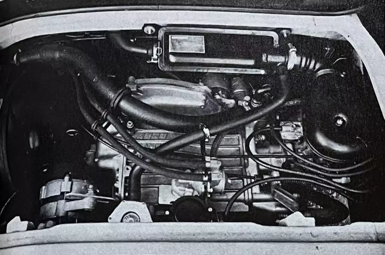 Еще одно крупное новшество — система охлаждения. Теперь она жидкостная и пришла на смену шумному вентилятору прошлых лет. Радиатор установлен вертикально в крайней левой части моторного отсека, параллельно заднему левому колесу, и снабжен отключаемым электровенилятором. Инженеры не поскупились и сразу оснастили новый мотор двухкамерным карбюратором с ручным приводом воздушной заслонки. «Подсос» жизненно необходим для холодного пуска, но мы пожалели об отсутствии контрольной лампы его работы — это важно, когда забываешь вернуть маленький рычажок (расположенный между передними сиденьями) в исходное положение. Также отметим установку водяного и масляного насосов на одной оси, что позволило сократить габариты. Двигатель расположен горизонтально в заднем свесе. Поразительно компактный, он без труда скрывается под полом багажника. Доступ к нему осуществляется через огромный (в сравнении с размерами багажника) люк, что обеспечивает исключительное удобство обслуживания, тем более что компоновка отсека выполнена очень эффективно. Механики оценят. Люк прилегает достаточно плотно, чтобы гарантировать отличную звукоизоляцию, в чем ему активно помогает тисненый пластиковый напольный коврик. Двигатель сохранил сегодня уже забытую продольную ориентацию. Он покоится на трех обычных эластичных опорах, которые достаточно изолируют его от кузова.