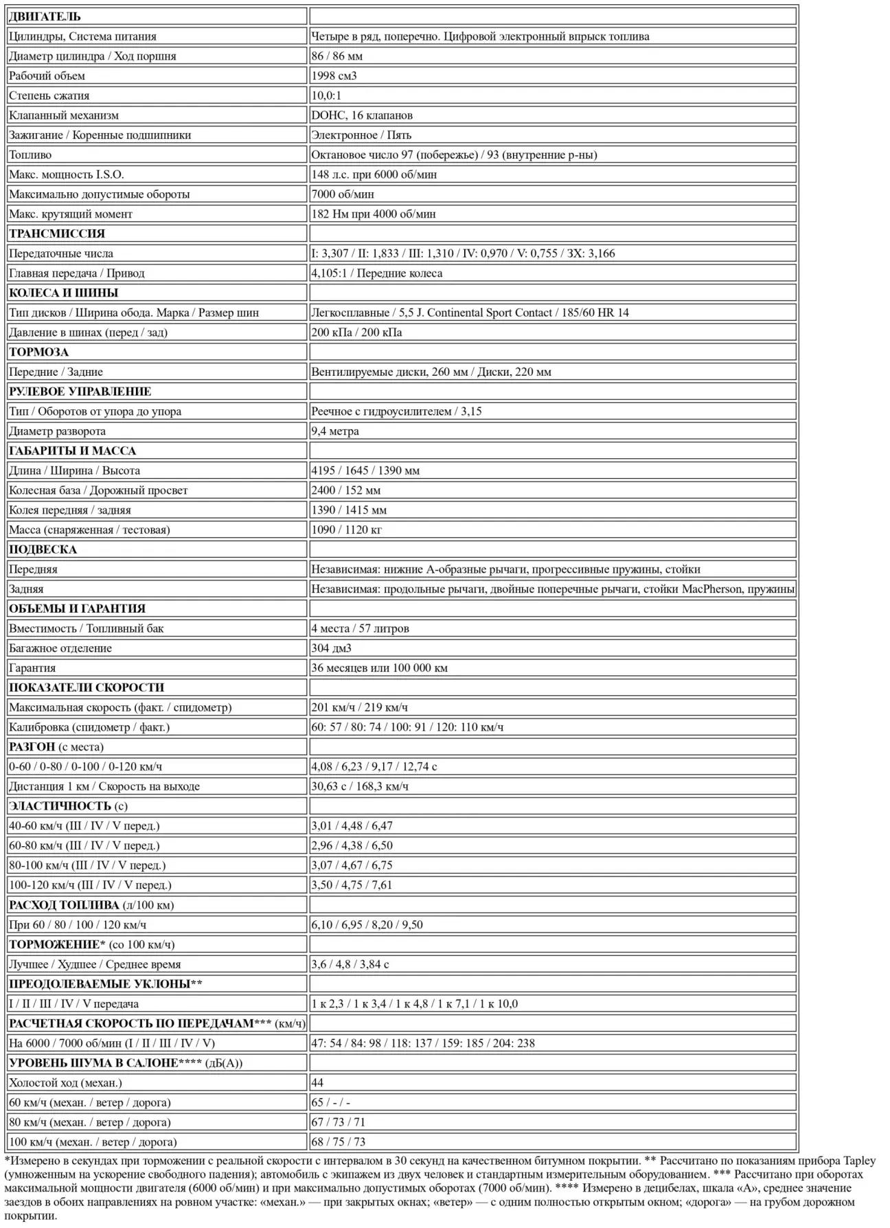 Наш тестовый автомобиль был оснащен радио и центральным замком, но его стальная запаска была обута в резину Dunlop размерности 185/60 R14, в то время как на самой машине стояли шины Continental. Руководство по эксплуатации предупреждало, что запаску следует использовать только как докатку, так как ее установка повлияет на управляемость, требуя снижения скорости (величина которой, кстати, не была указана). Также не было ясности с моторным маслом: инструкция просто советовала 20W50, тогда как высокофорсированному агрегату с верхним расположением распредвалов гораздо лучше подошел бы первоклассный смазочный материал категории SG, а не, скажем, SF или SC.