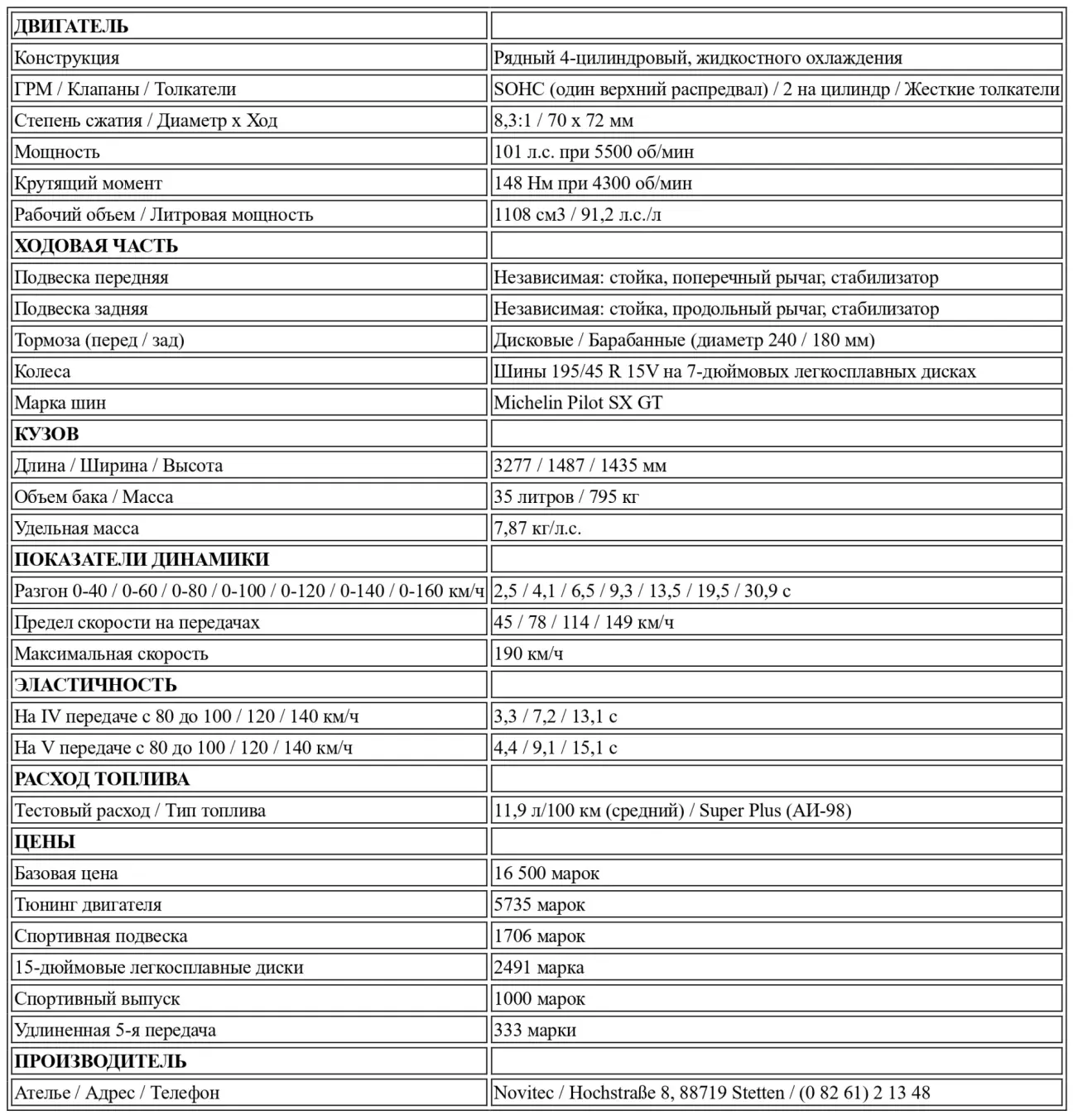 В обычном режиме Novitec расходует 11,9 литра бензина Super Plus на сто километров. При активной же езде система впрыска от Novitec порой прогоняет через впускные клапаны до 15 литров. Впрочем, кто покупает такую маленькую ракету, чтобы ездить медленно? Как-никак на автобане Novitec достигает максимальной скорости 190 км/ч. При этом стрелка тахометра бодро пляшет в красной зоне. Шестиступенчатая коробка передач с более «длинными» числами должна в скором времени исправить ситуацию.