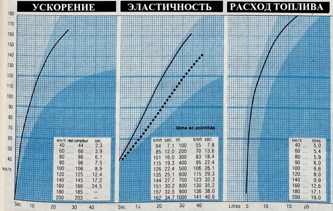 Наши секундомеры зафиксировали такие показатели ускорения: 100 км/ч с места были достигнуты за 8,9 секунды (тогда как Nissan заявляет 9,6). 400 метров потребовали всего 16,1 секунды терпения (завод утверждает 16,9). Что касается километра, он был преодолен за 29,9 секунды. Весьма недурно, не правда ли? В плане эластичности итог самый благоприятный. Замеренное время представляет интерес, но прежде всего оно позволяет построить характерные графики. Взгляните на их начертание: оно скажет вам больше долгого дискурса и подтвердит блеск мотора на всех режимах, начиная уже с 40 км/ч!