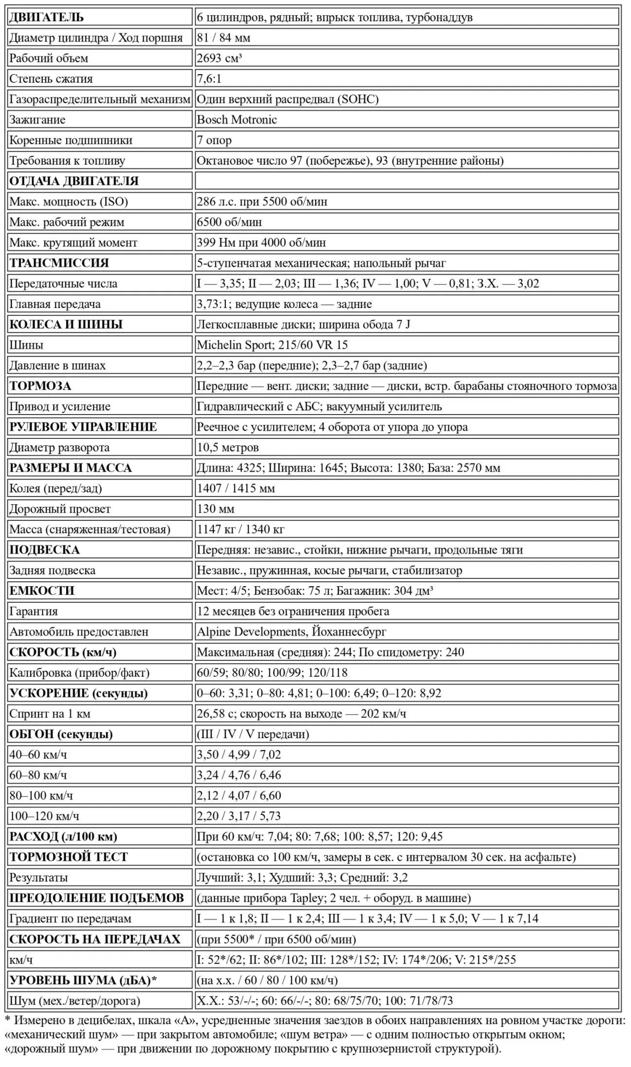 С 286-сильной турбо-установкой от Alpine под капотом эта машина становится смертельно опасной на мокром асфальте. И в то же время она дарит истинное наслаждение от вождения на сухом покрытии...