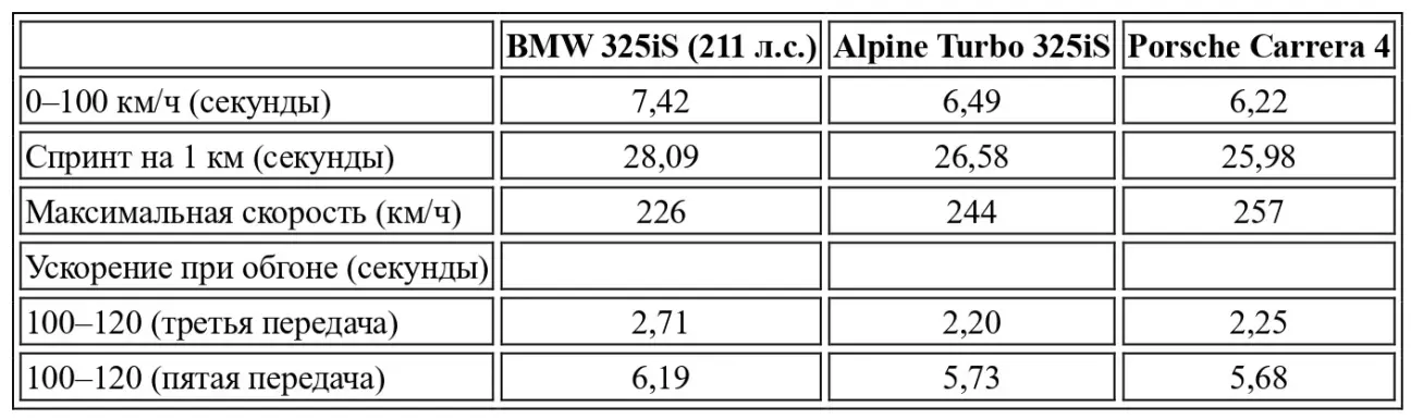Фактически, преимущество над стандартной 325iS (протестированной нами в прошлом месяце) составляет 50 процентов по крутящему моменту и 36 процентов по мощности. Интересно, что наши весы не зафиксировали увеличения массы по сравнению со стоком при полном баке и установленной измерительной аппаратуре — возможно, в Alpine умудрились где-то сэкономить вес, чтобы компенсировать массу турбины, интеркулера и сопутствующей обвязки.