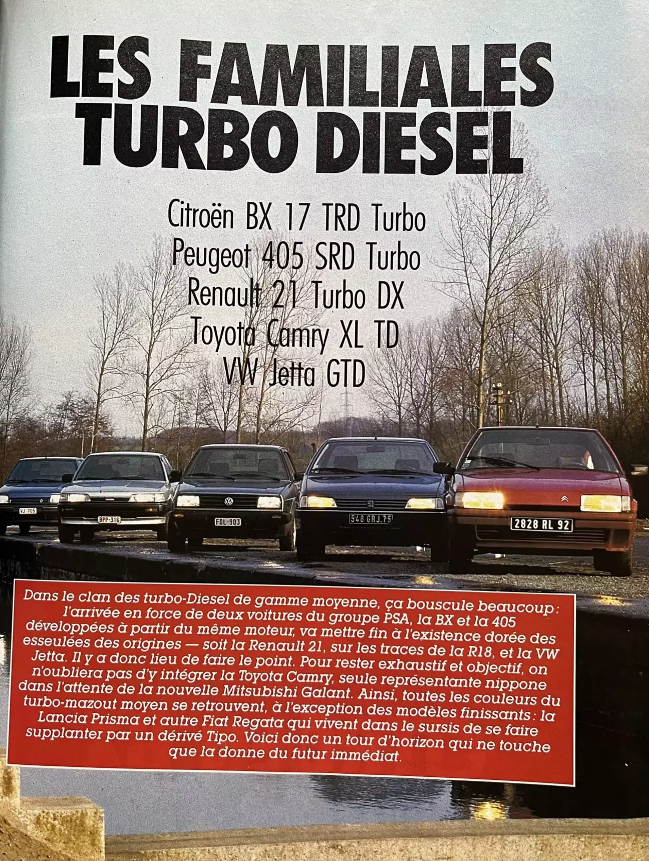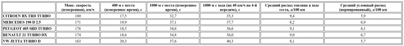 Citroën BX 17 TRD Turbo, Peugeot 405 SRD Turbo, Renault 21 Turbo DX, Toyota Camry XL TD, VW Jetta GTD.
