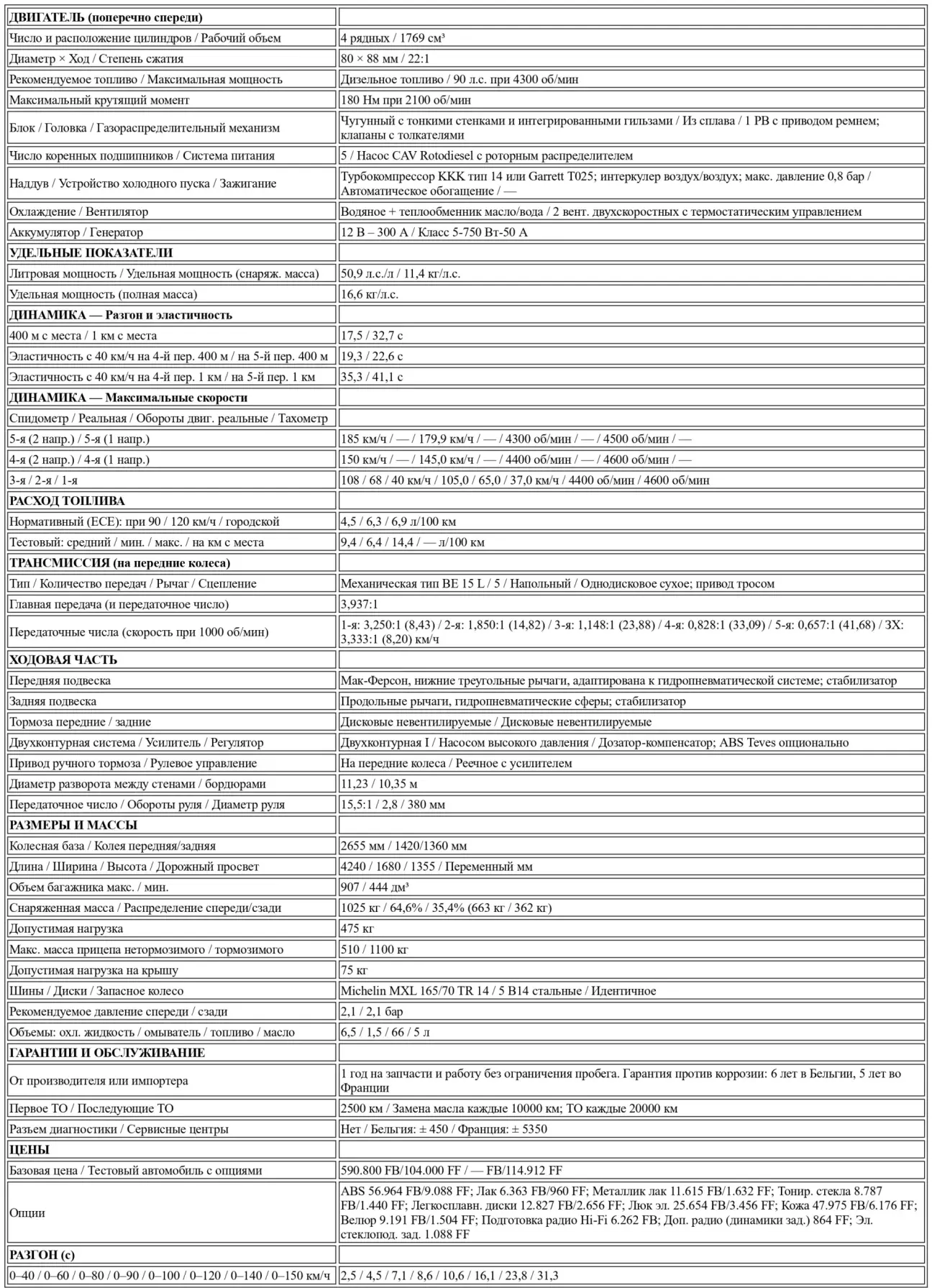 При длине 4,24 метра BX является «малым средним высшим» автомобилем, и можно считать, что он располагается на стыке классов, которые мы называем средними и семейными. Для данного обзора турбодизелей мы выбрали также VW Jetta (4,31 м), чей 1600-кубовый мотор с наддувом, несомненно, сыграл роль первопроходца, новейший 405 SRD Turbo (4,40 м), R21 (4,46 м) и — специально для наших бельгийских читателей — Toyota Camry (4,5 м).