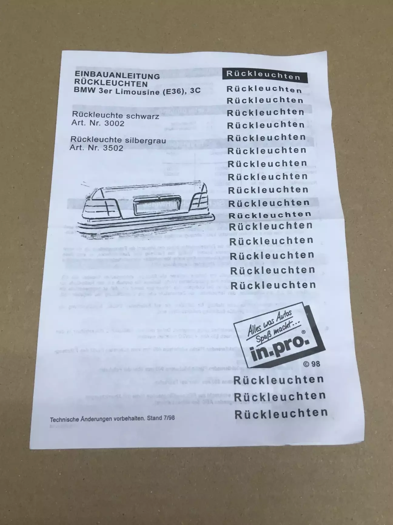 Продам комплект рідкісних задніх ліхтарів для BMW E36 (Limousine) від тюнінг-підрозділу Hella - In.Pro. Art. Nr. 3502 Ліхтарі НОВІ, у заводських пакуваннях та з сертифікатом TUV. Без дефектів! Додаткові фото - за запитом.
